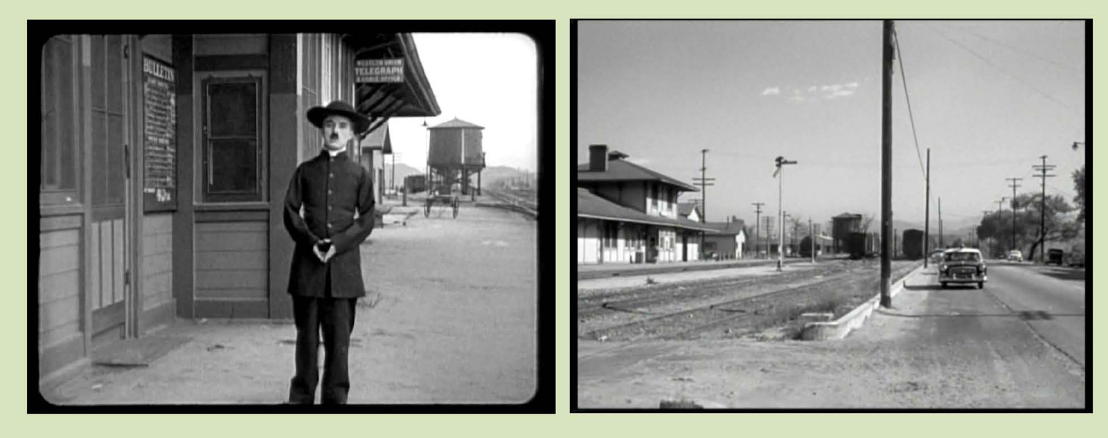 Looking south down Lillian Way from Eleanor towards the Vine Street Elementary School – Chaplin in The Fireman and Keaton (inset) in the same spot eight years later in Sherlock Jr. Their common studio stands off camera to the right.