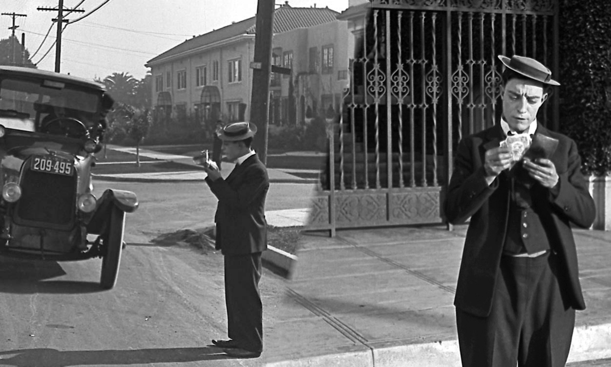 Because Charlie Chaplin filmed his Mutual comedy shorts (1916-17) at the same small studio where Buster Keaton later filmed his independent shorts and features (1920-28), many common locations and settings appear in their films (see above). I explain this in great detail in my books, and in other posts, in part by deconstructing vintage aerial photographs looking south towards the studio that once stood at 1025 Lillian Way in Hollywood at the SW corner of Eleanor.