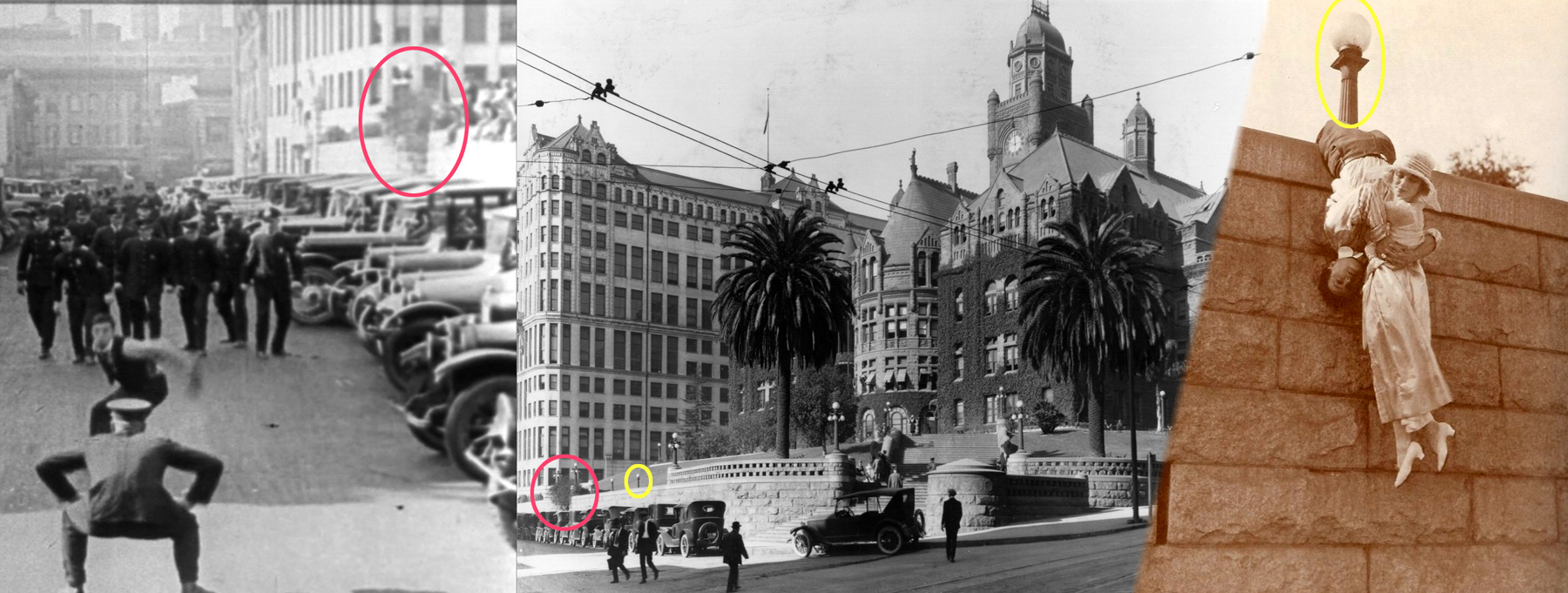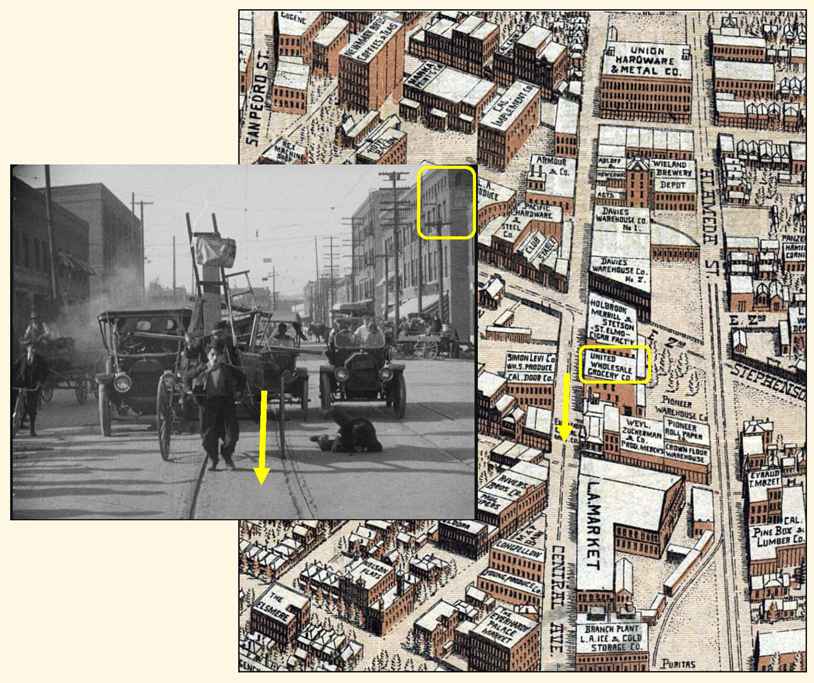 This detailed view matches a 1922 aerial photo with the 1916 movie frame – 900 Vine Street (yellow box) stands at back.