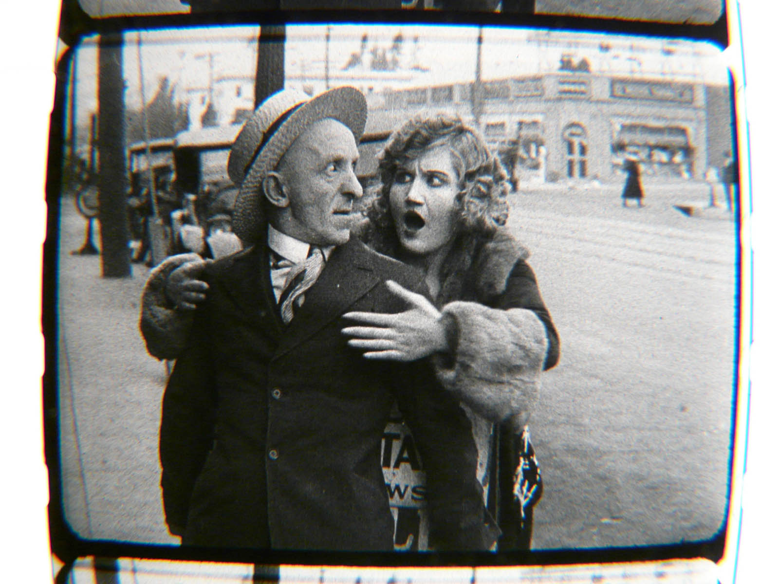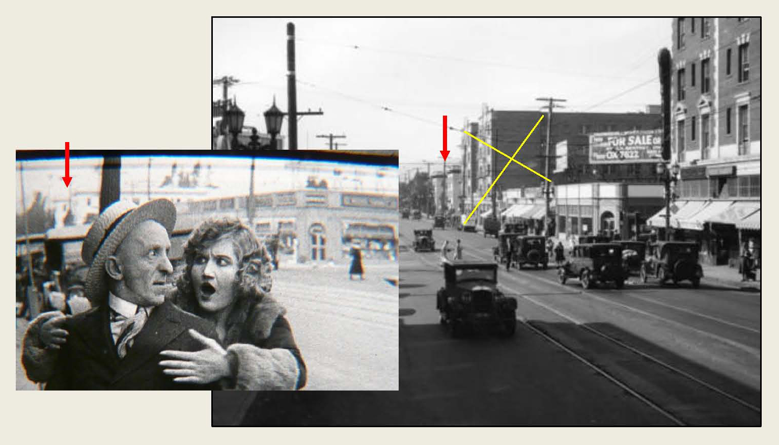 Returning to Convict 13, Buster runs south down Lillian Way by the studio office, with the shadow of Leo White’s telephone pole (blue), a car driving north up Vine (red box), and the homes at 6200 and 6206 Eleanor (yellow box) at back.