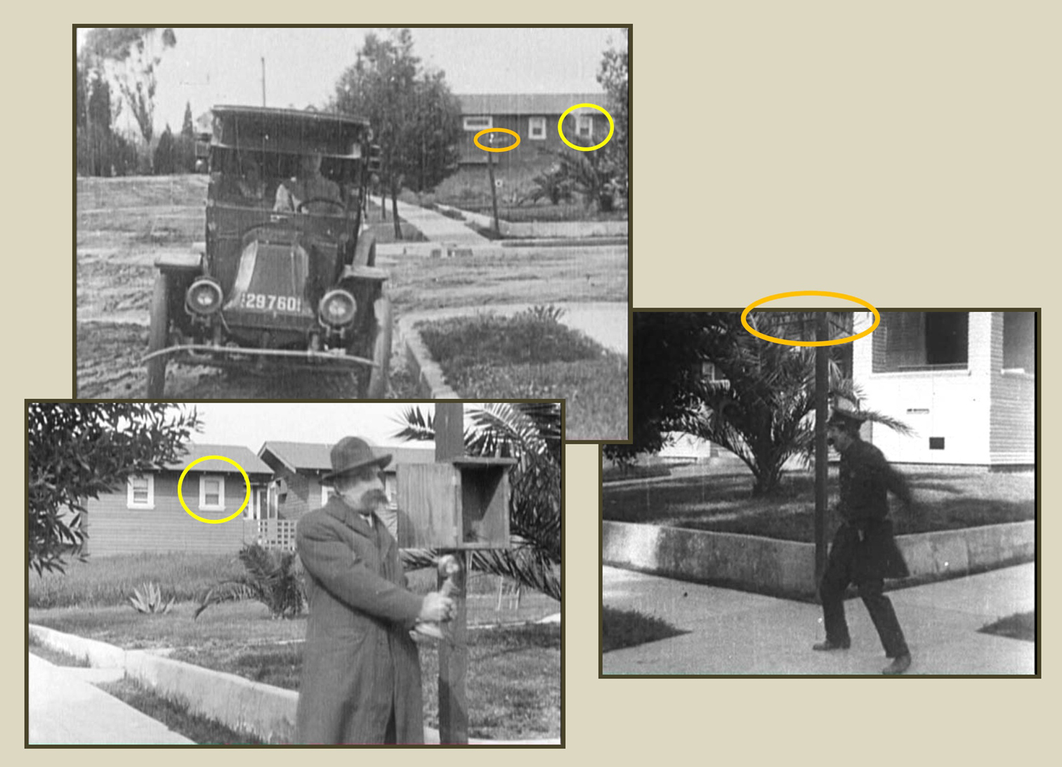 Cruel, Cruel Love (top), A Film Johnnie (bottom). Between the bungalows and the corner home, on what was a vacant lot during the 1914 filming, is an apartment block (oval) built in the 1920s.