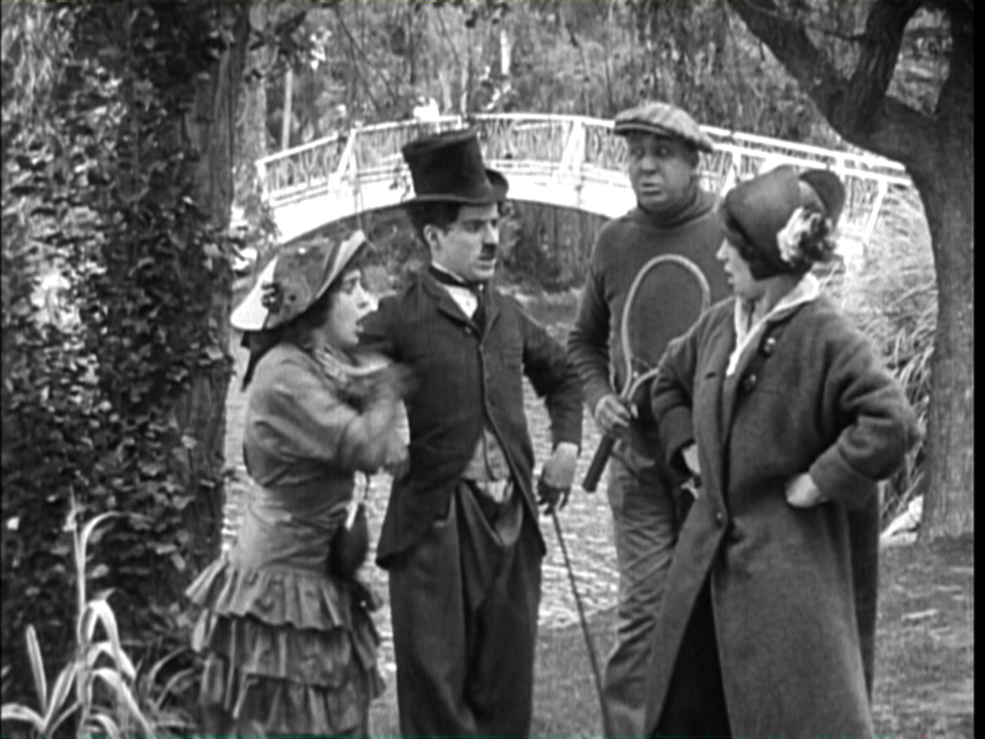 Mabel Normand, Chaplin, Mack Swain, and Eva Nelson in Mabel’s Married Life (1914) beside the Echo Park bridge.