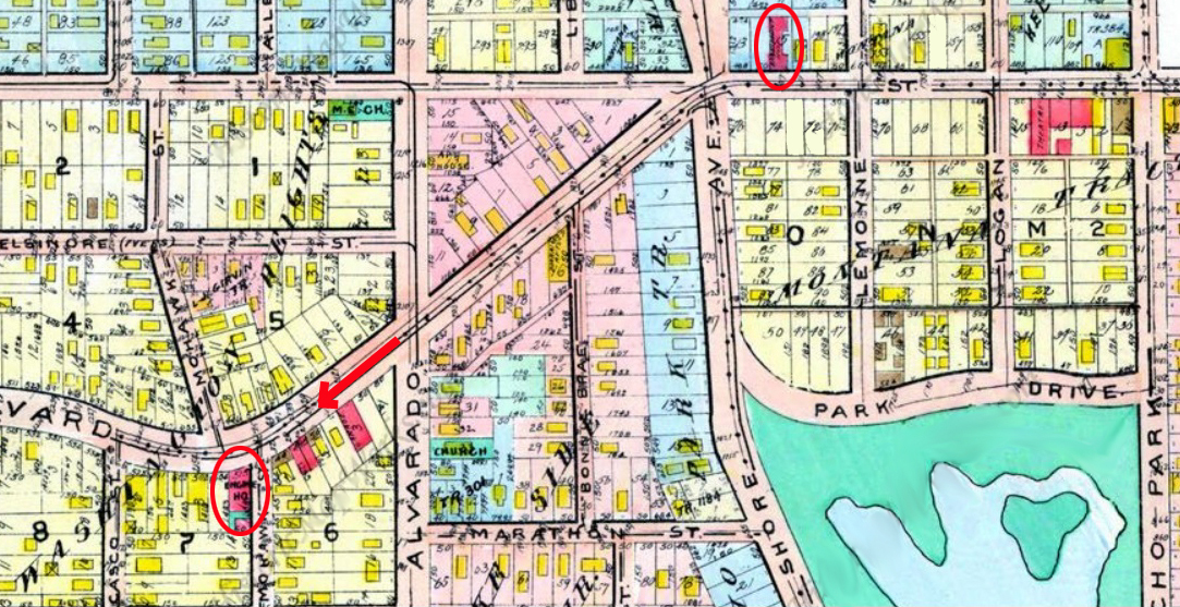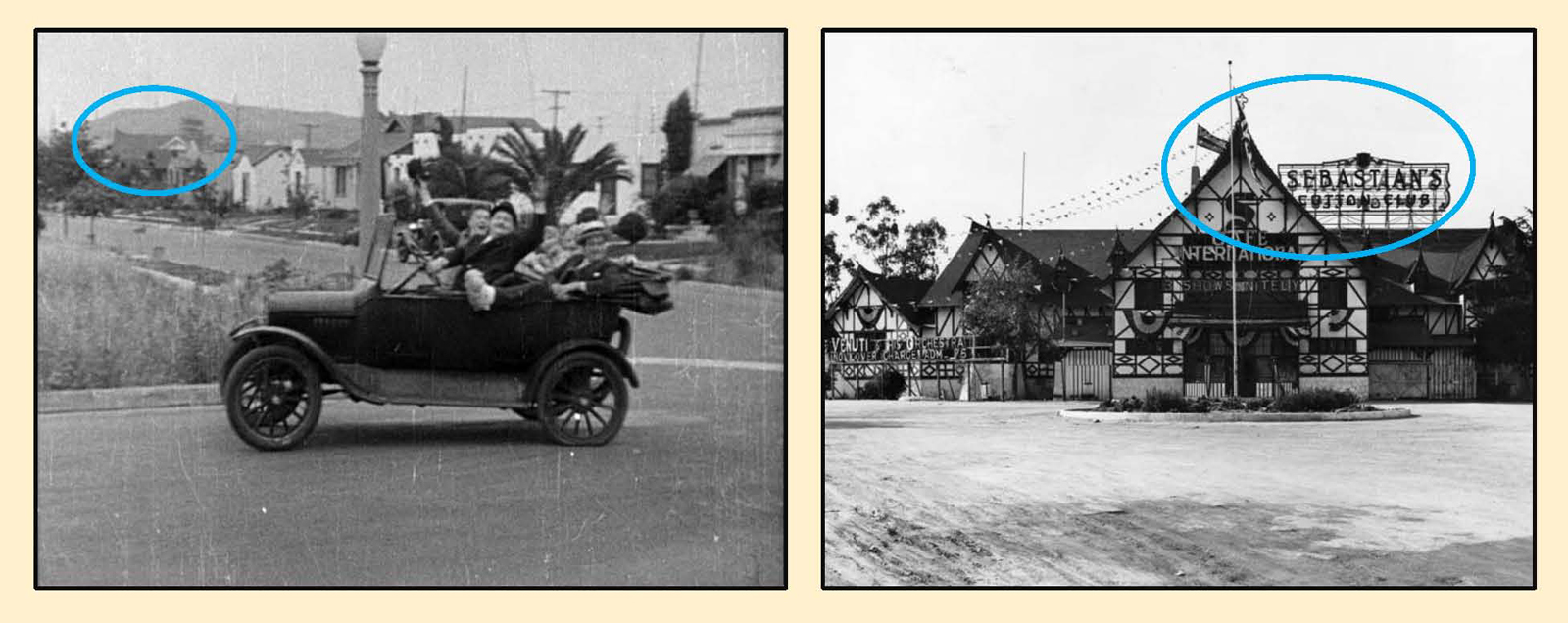 As Stan dashes up Vera, a hilltop structure appears behind him. The two candidates are the former California Country Club upper left oval on map, or the former Pacific Military Academy, right oval. The upper right photo shows the club circa 1923. USC Digital Library.