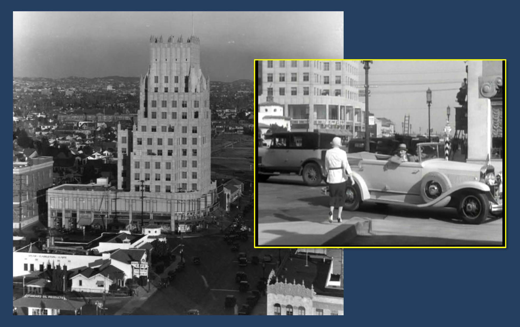 Cagney drops Harlow off at Wilshire, west of the corner of Dunsmuir, with the Wilshire Tower Building in the background. California State Library