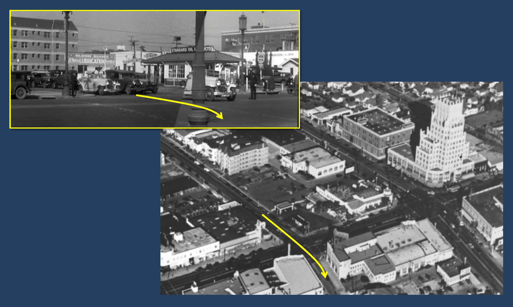 Why, if Cagney met Harlow on the corner of Detroit, was she was first filmed at the corner of Cloverdale? Because at the time the Detroit corner was an un-photogenic parking lot. The parking lot curb (oval) appears in the movie frame looking east, and in this 1932 view looking west, taken from the E. Clem Wilson Building. LAPL