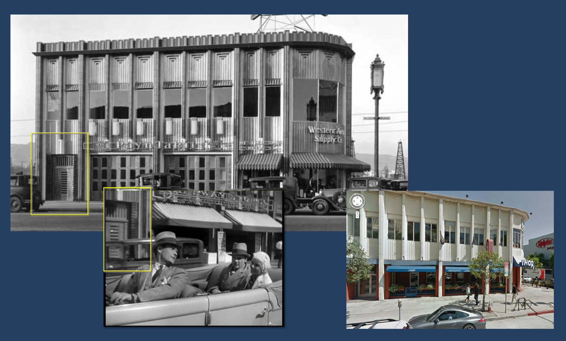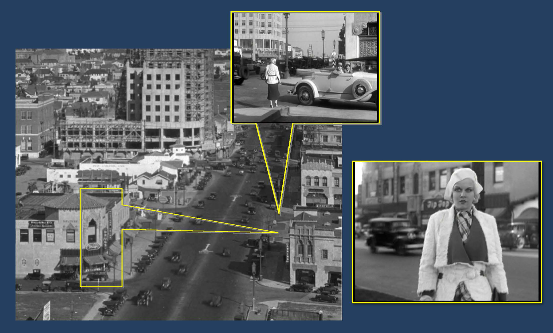 Cagney stopped at the corner of Detroit (above). Harlow is introduced in closeup standing on Wilshire, near the same corner. Behind her, looking to the NW, are buildings (callout box) on the north side of Wilshire. USC Digital Library