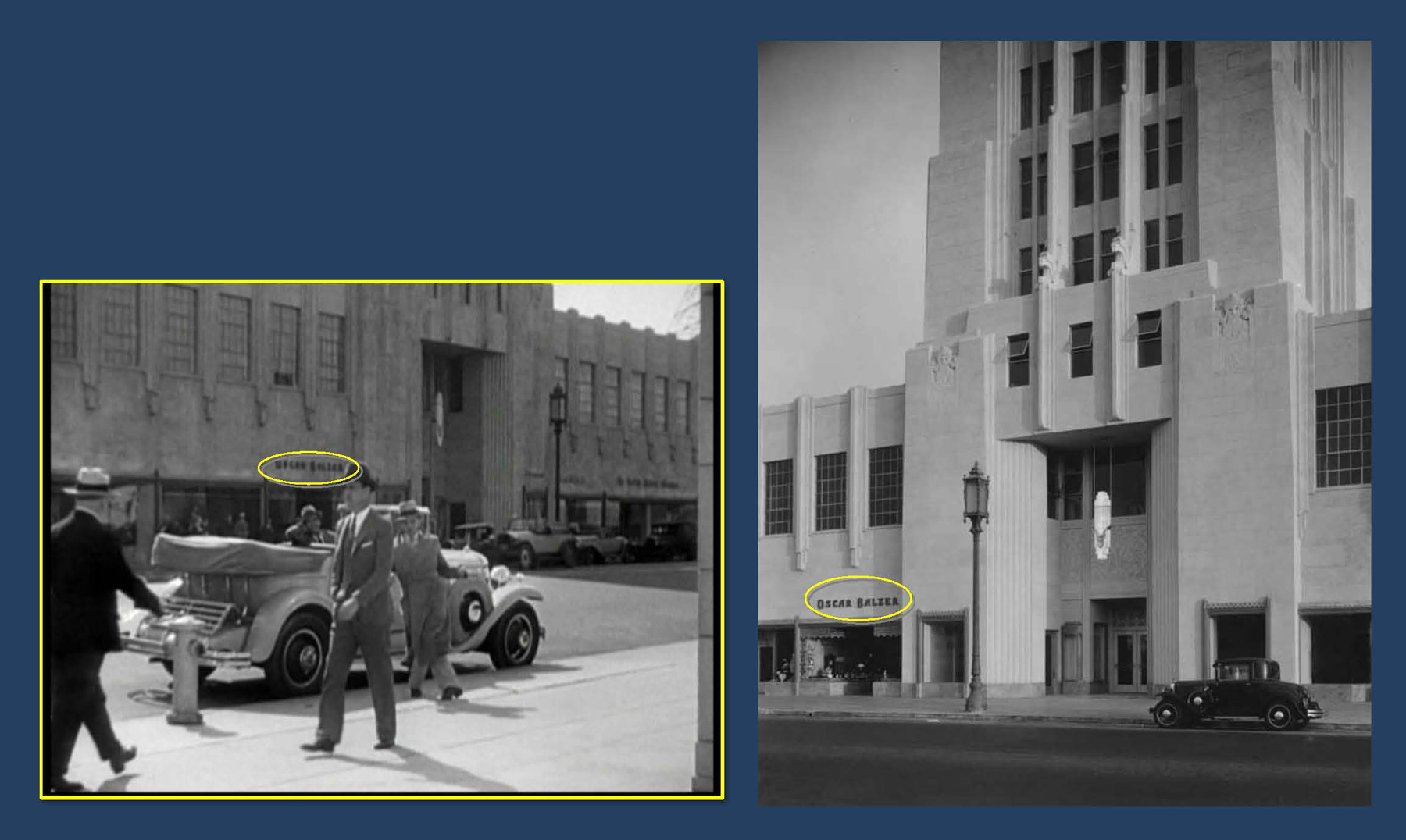 Delighted to get Jean Harlow’s phone number, Cagney dances a little jig, sadly blocked from view by extras walking in front of the camera. The Oscar Balzer shop appears in both images. California State Library.