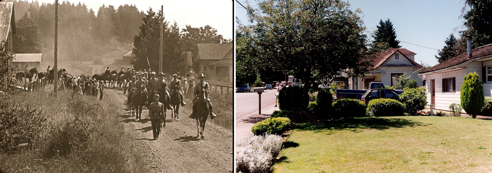 Then and Now – 221 South 16th Street in Cottage Grove, Oregon, appears behind Buster during filming.