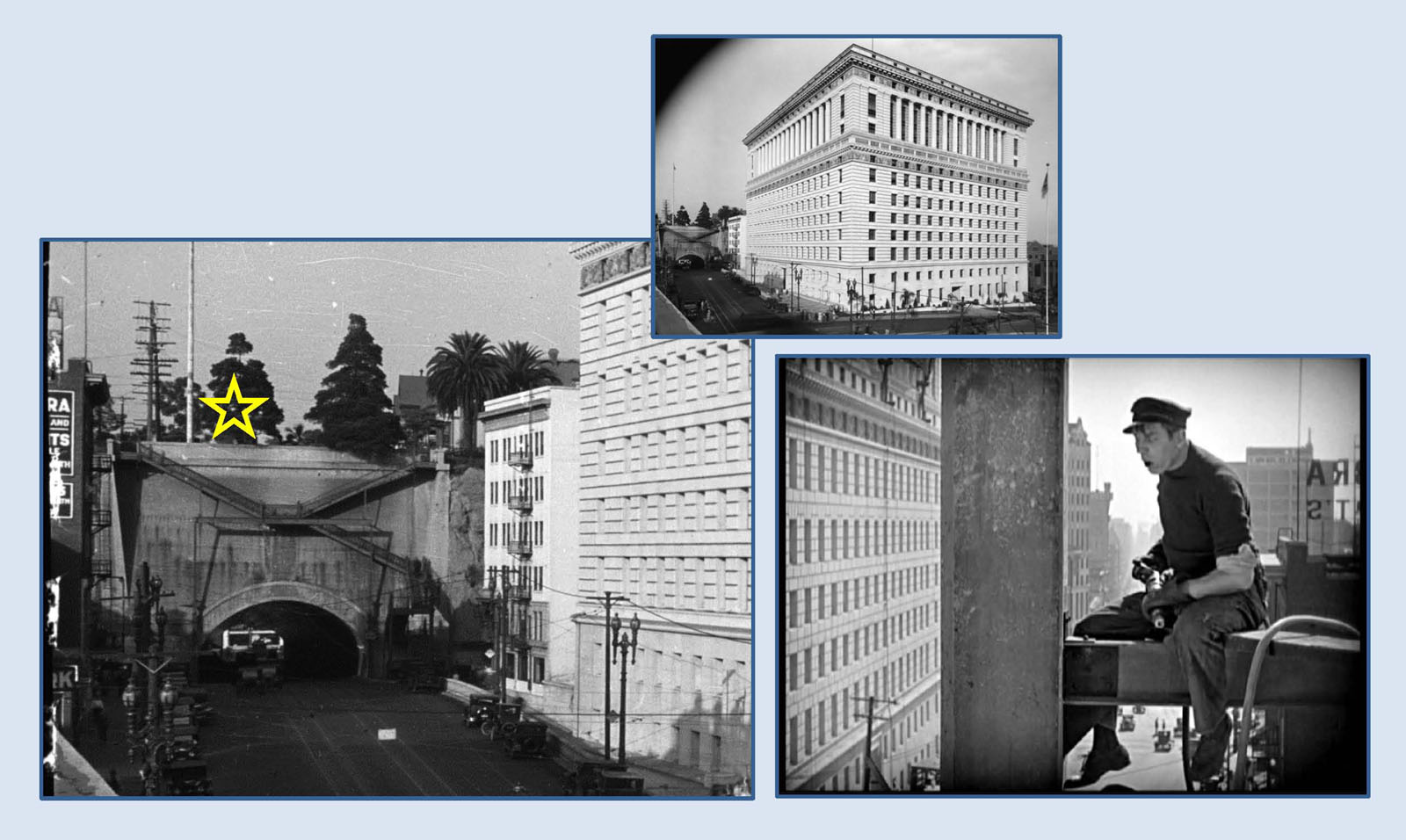 Update – a rare clear view of the back of the 2nd Street Tunnel and the Hotel Stanley Apartments matching in the Chaplin frame. (C) The J. Paul Getty Trust – The Getty Research Institute Los Angeles.