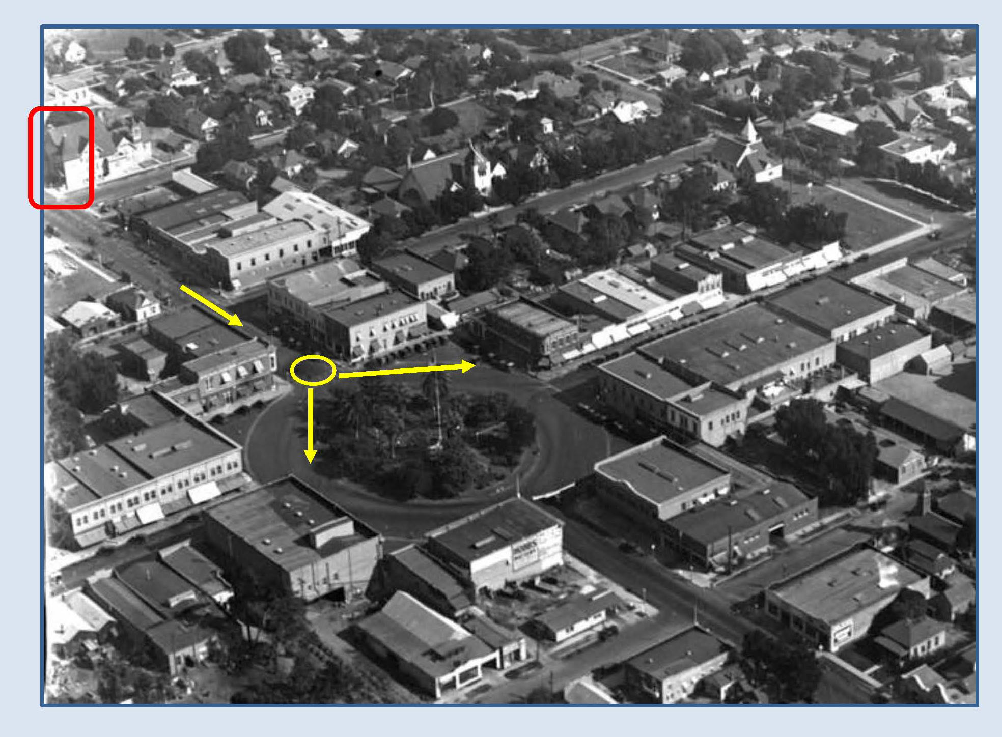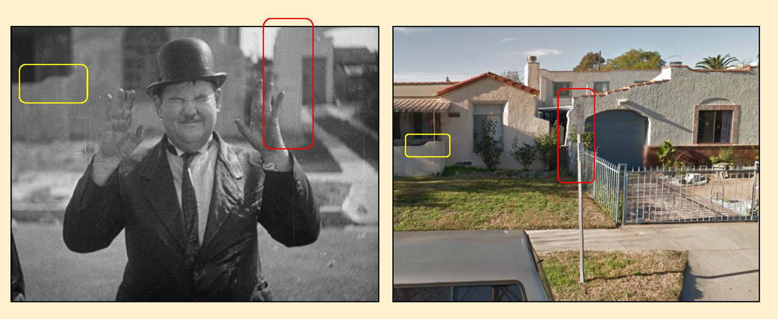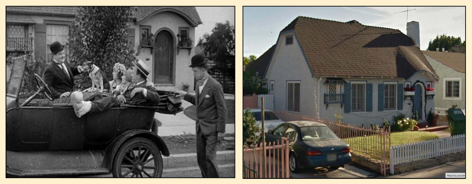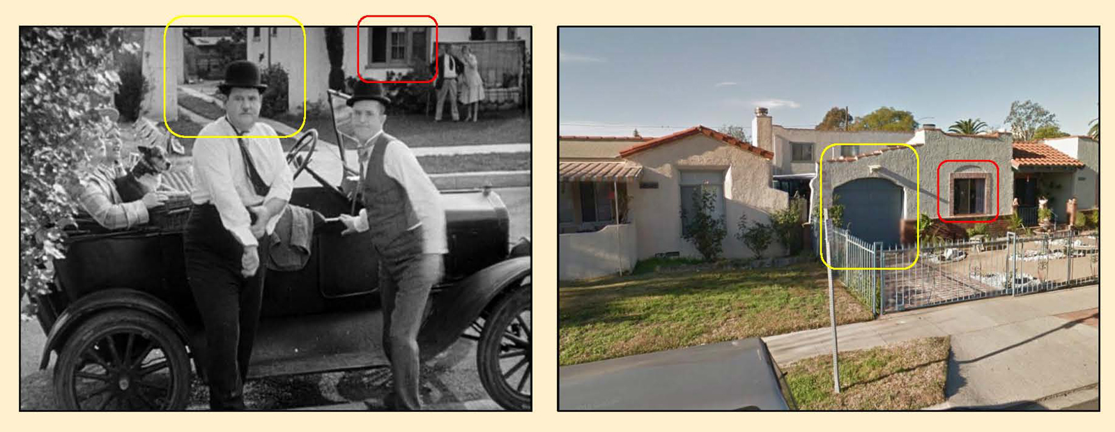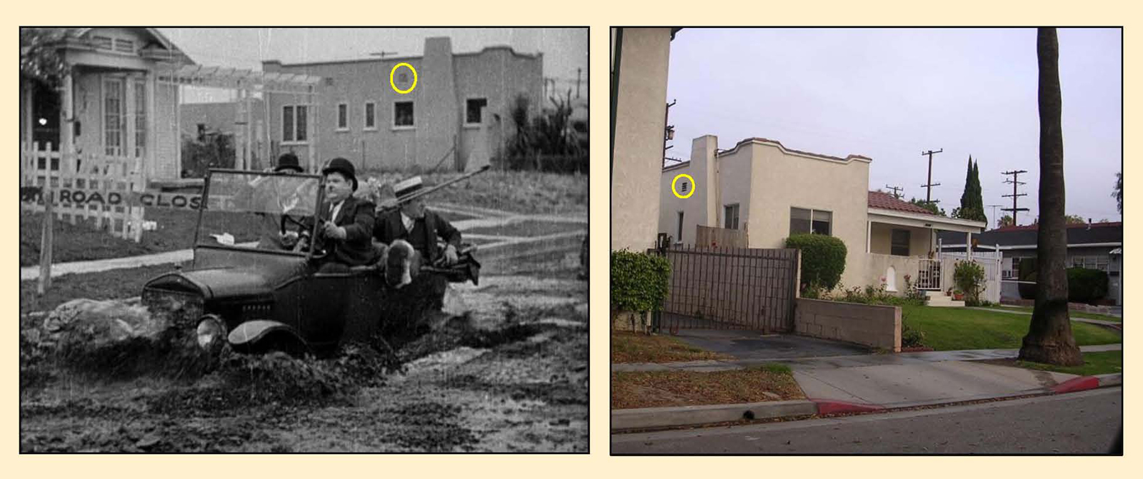 These homes along 3129, 3123, and 3121 Ivy Ave. appear at back as Stan and Ollie make their turn. The ovals mark corresponding details.