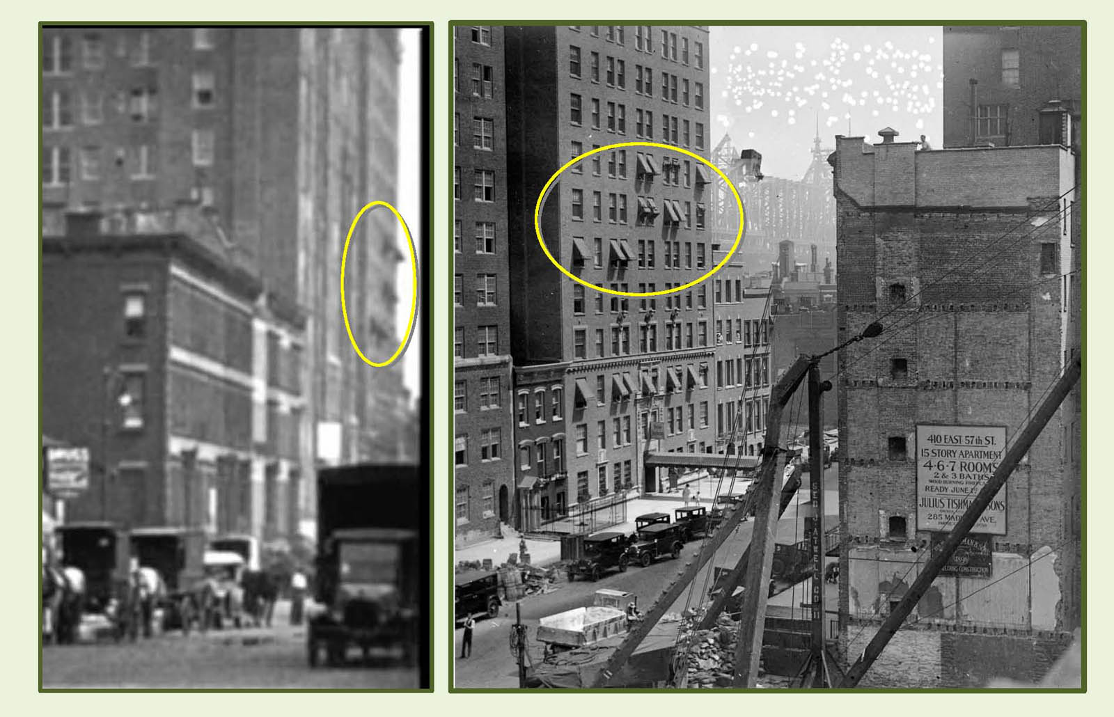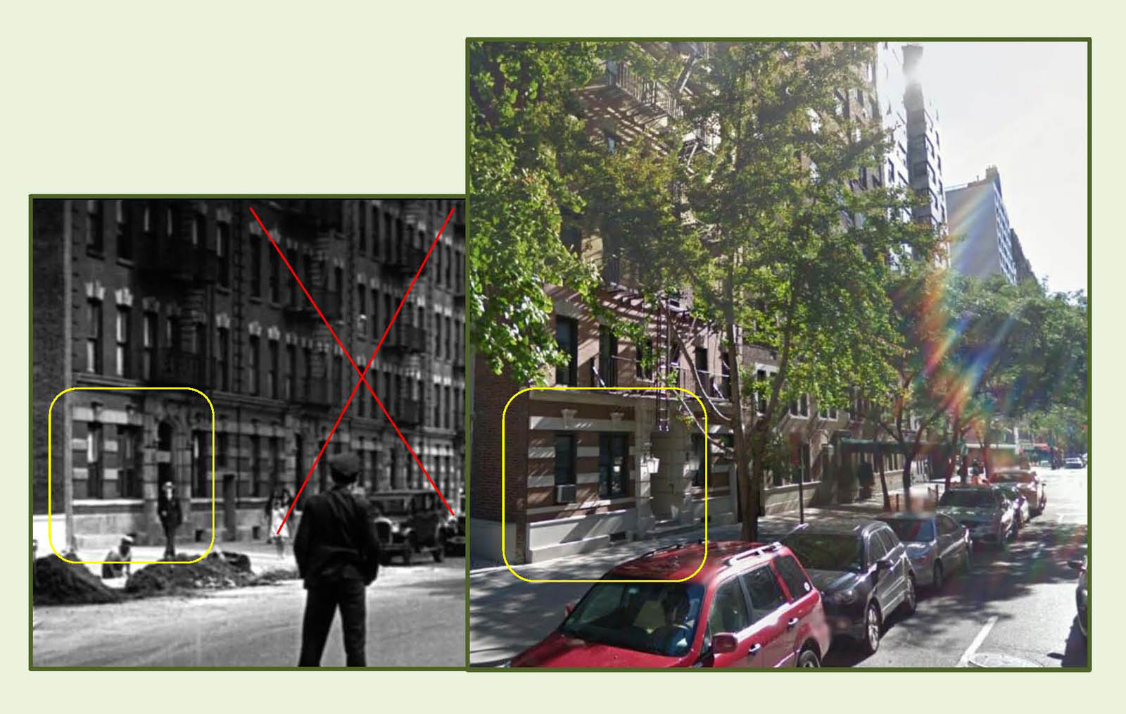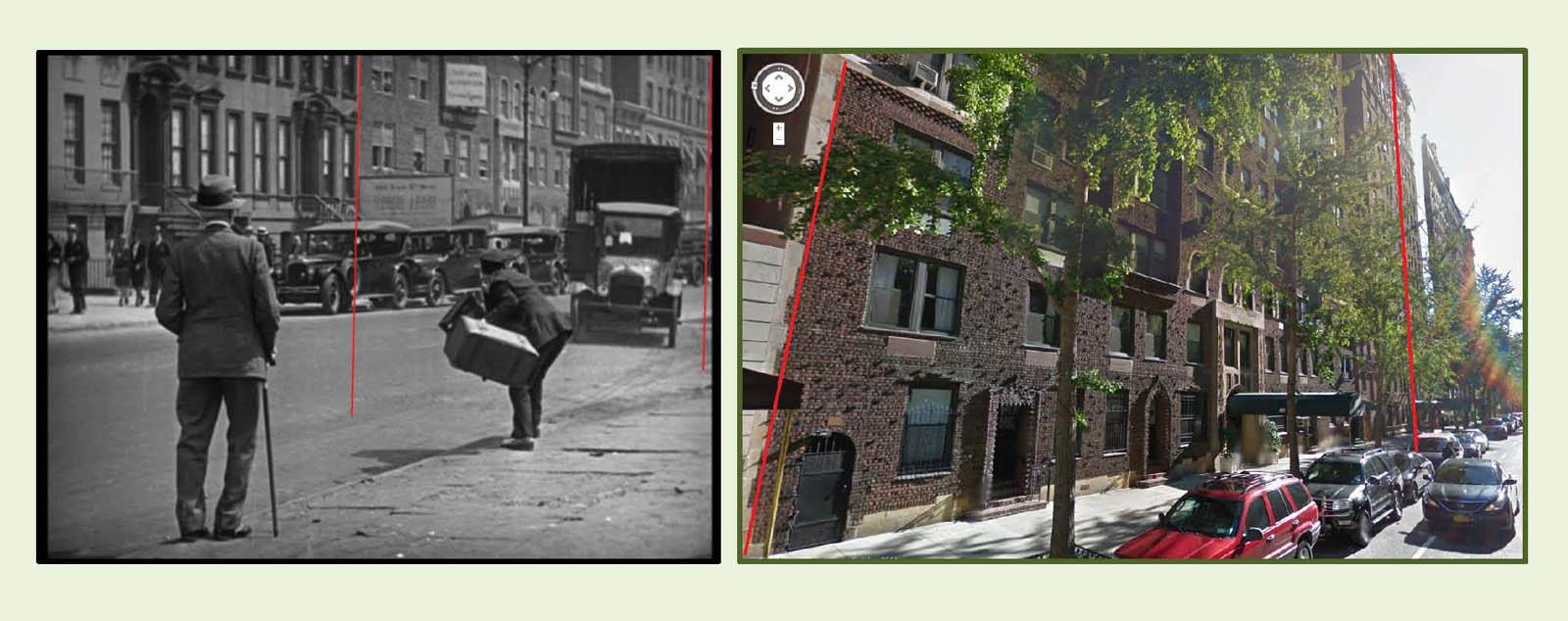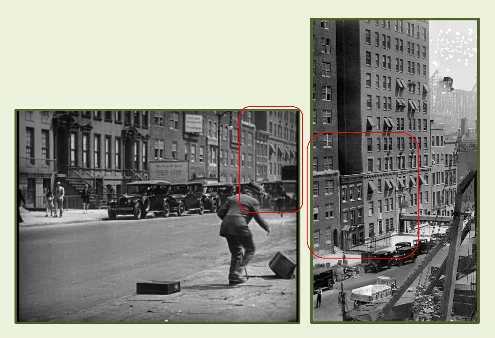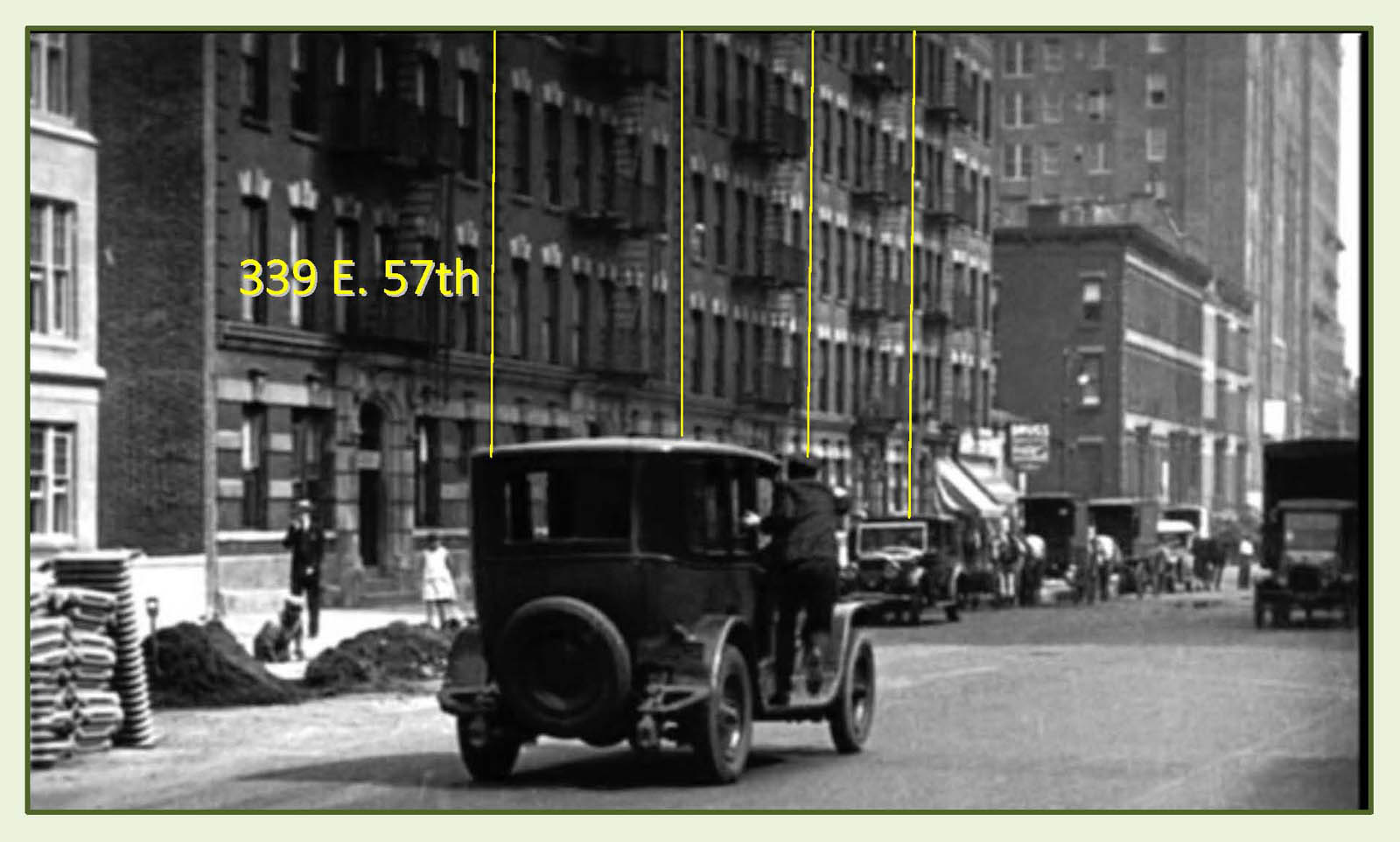 During Speedy Harold Lloyd chases after his errant taxi by jumping on a passing car in front of 339 E. 57th St in New York. The four identical apartments to the east are now all lost to much taller buildings.