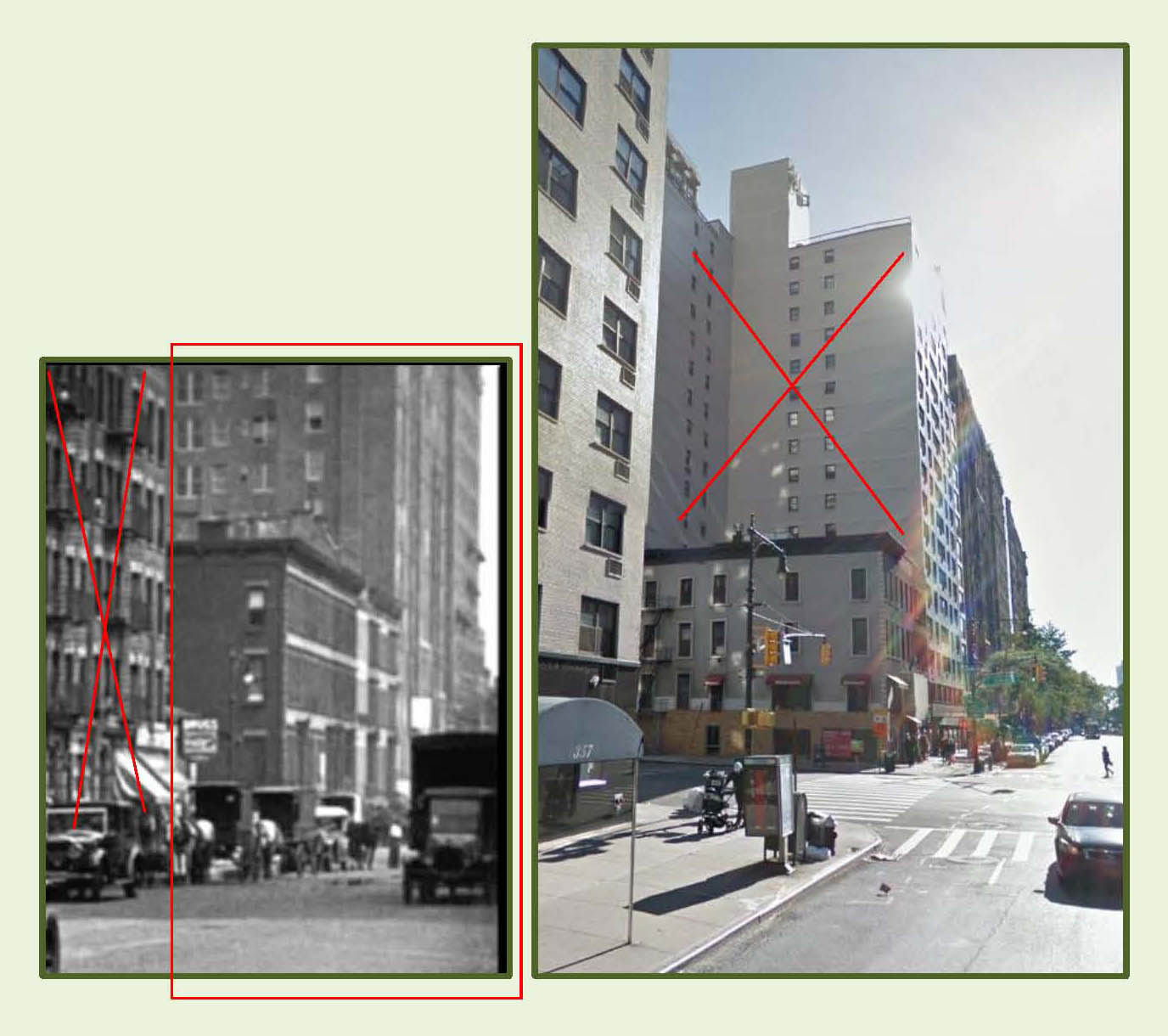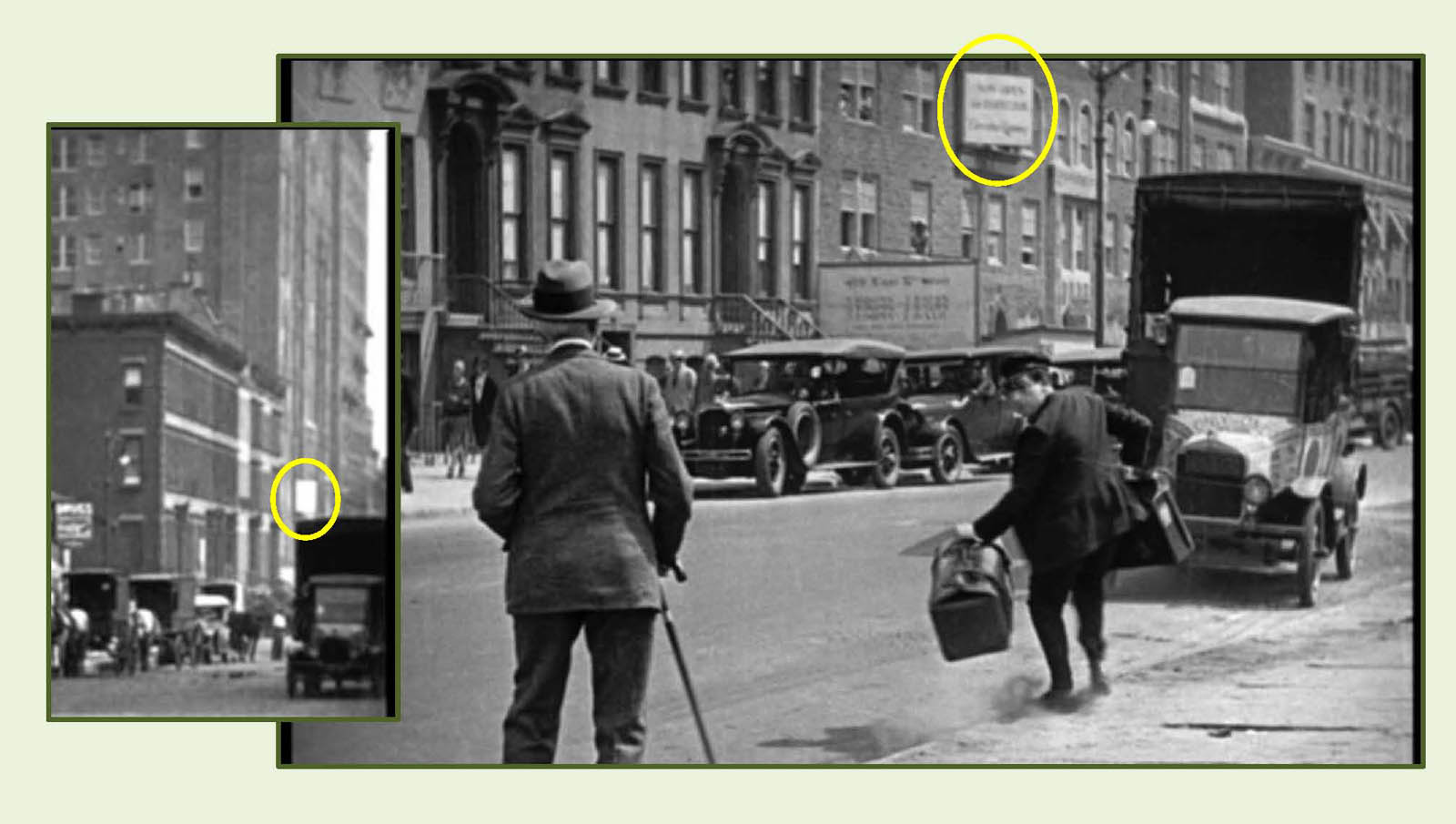 Click to enlarge. Matching views from Cruel, Cruel Love (top), A Film Johnnie (bottom) and A Flirt’s Mistake (right). The street sign (orange oval) reads “Park Ave.”