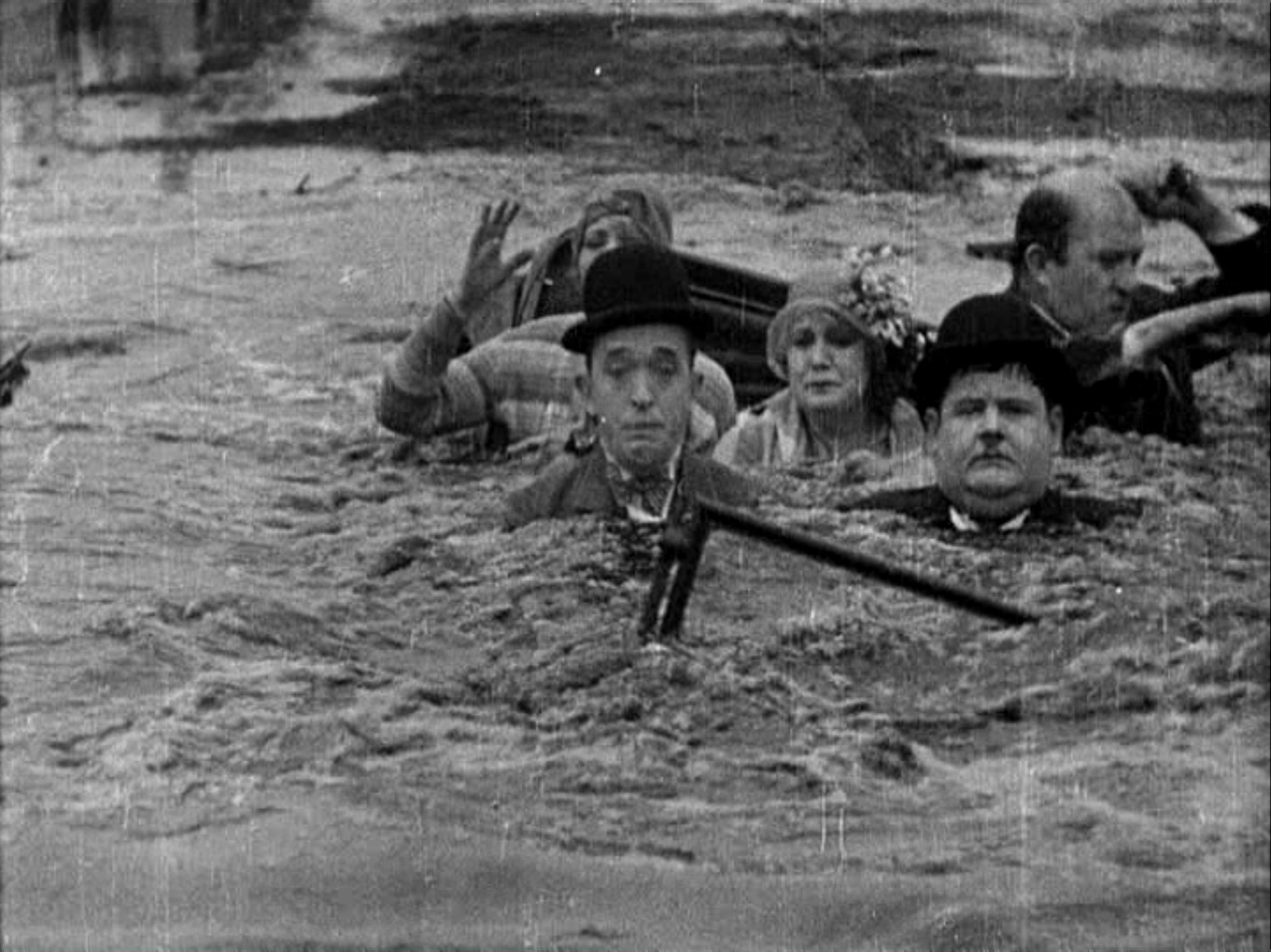 The movie concludes with a cartoon-style joke. Stan and Ollie flee the mansion dressed in a two-person wildebeest costume (don’t ask), then quickly commandeer a tandem bicycle. The police chase the bicycling duo into a tunnel when a trolley approaches. The speeding trolley car strips the police of their clothing, while Stan and Ollie emerge from the other end of the tunnel relatively unscathed, but now riding unicycles, suggesting their tandem bike was torn in two.