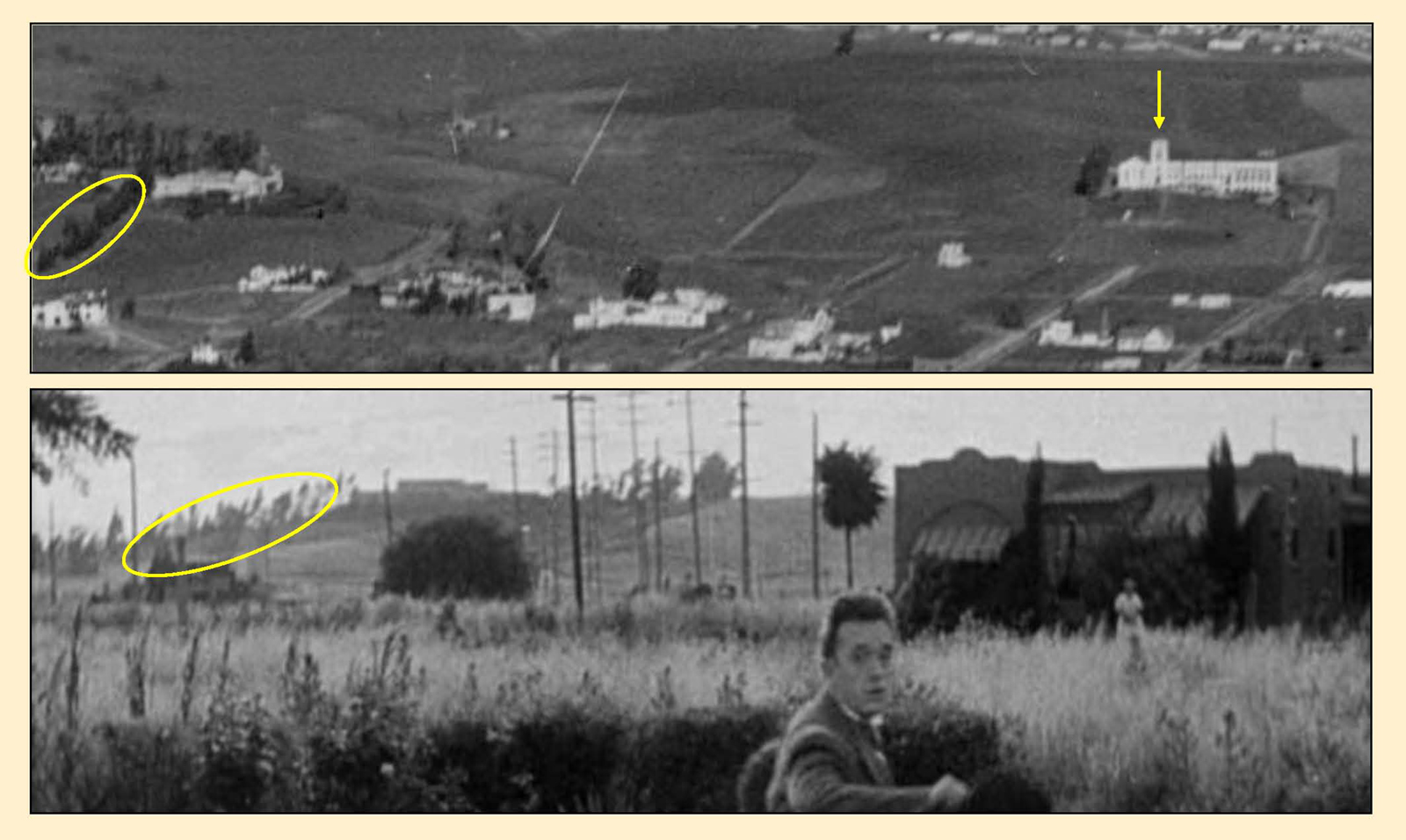 Although the movie frame could be more clear, after studying several photos, including the above, I believe the former California Country Club to the left above is the hilltop building appearing behind Stan. The club had a row of trees to the west (oval), and a flat profile. The former Pacific Military Academy had no trees to the west, and a tall five story tower (arrow) that would likely stand out in the movie frame. The home behind Stan is likely 2975 Bedford, now lost to the freeway. HollywoodPhotographs.com