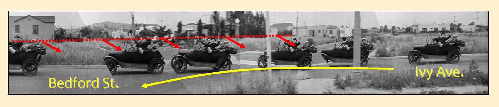 Looking SW towards the Hal Roach Studio (red), Sebastian’s Cotton Club (blue), the Vera Ave. primary filming site (yellow oval), the Boys’ left turn from the dead-end of Ivy onto Bedford (arrow), and the Helms Ave. filming site for the film’s sinking car finale (orange oval). The narrow parallel lines mark the route of modern Regent Street that replaced Bedford, the wide lines mark the path of the modern Santa Monica Freeway that subsumed Bedford and the homes alongside it.