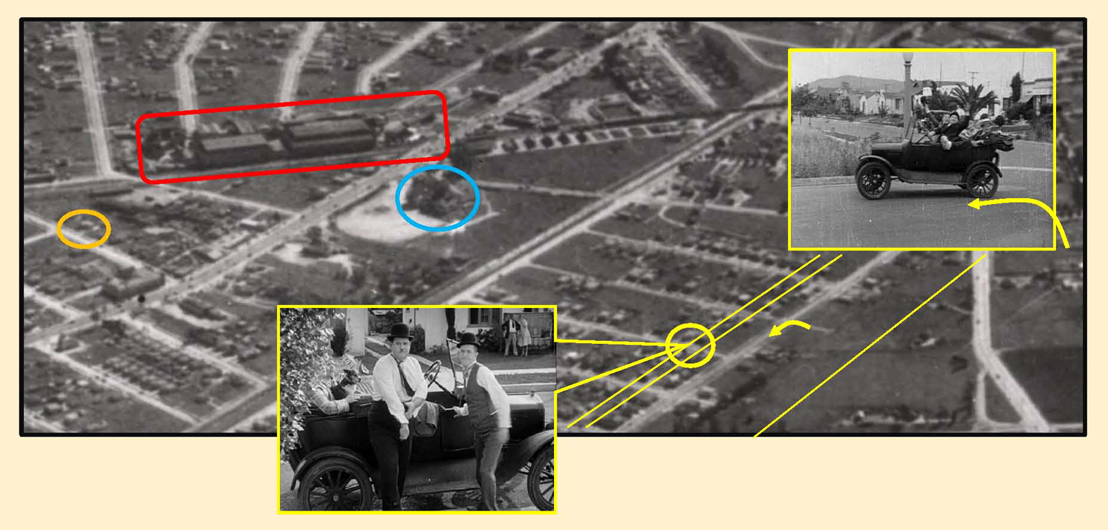 Looking east at the Cotton Club (blue) across the street from the Roach Studios (red). The sinking car finale (orange) was filmed on Helms just north of where Jacob Street meets Helms. Marc Wanamaker – Bison Archives.