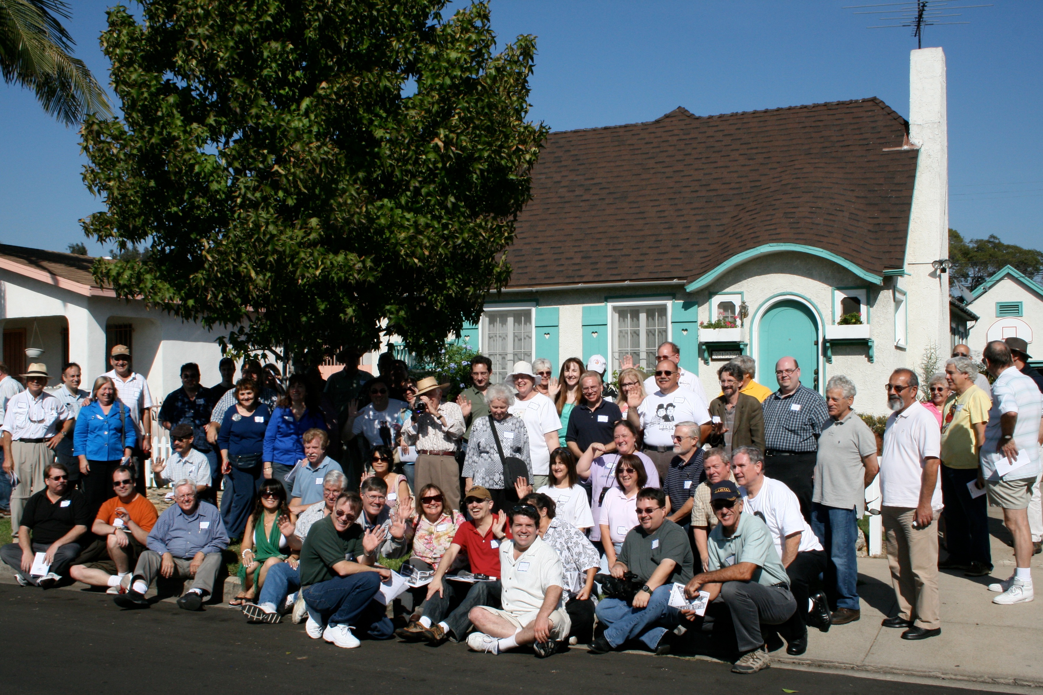 I first learned of this setting reading Pratfall, the 1985 Way Out West Tent filming location guide documenting Bob Satterfield’s many Laurel & Hardy discoveries. You can see at left a large group of happy fans posing in front of the home during a 2009 tour hosted by the Way Out West Tent, the Los Angeles chapter of the Sons of the Desert International Laurel & Hardy Society. (Jim Dallape and Robert Winslow are co-creators of the amazing Hal Roach Studios Backlot Tour, hosted as part of Dave Lord Heath’s astounding Another Fine Mess website, which provides encyclopedic details about nearly the entire output of the Roach Studios.) For a better view, please CLICK TO ENLARGE each image and map below.