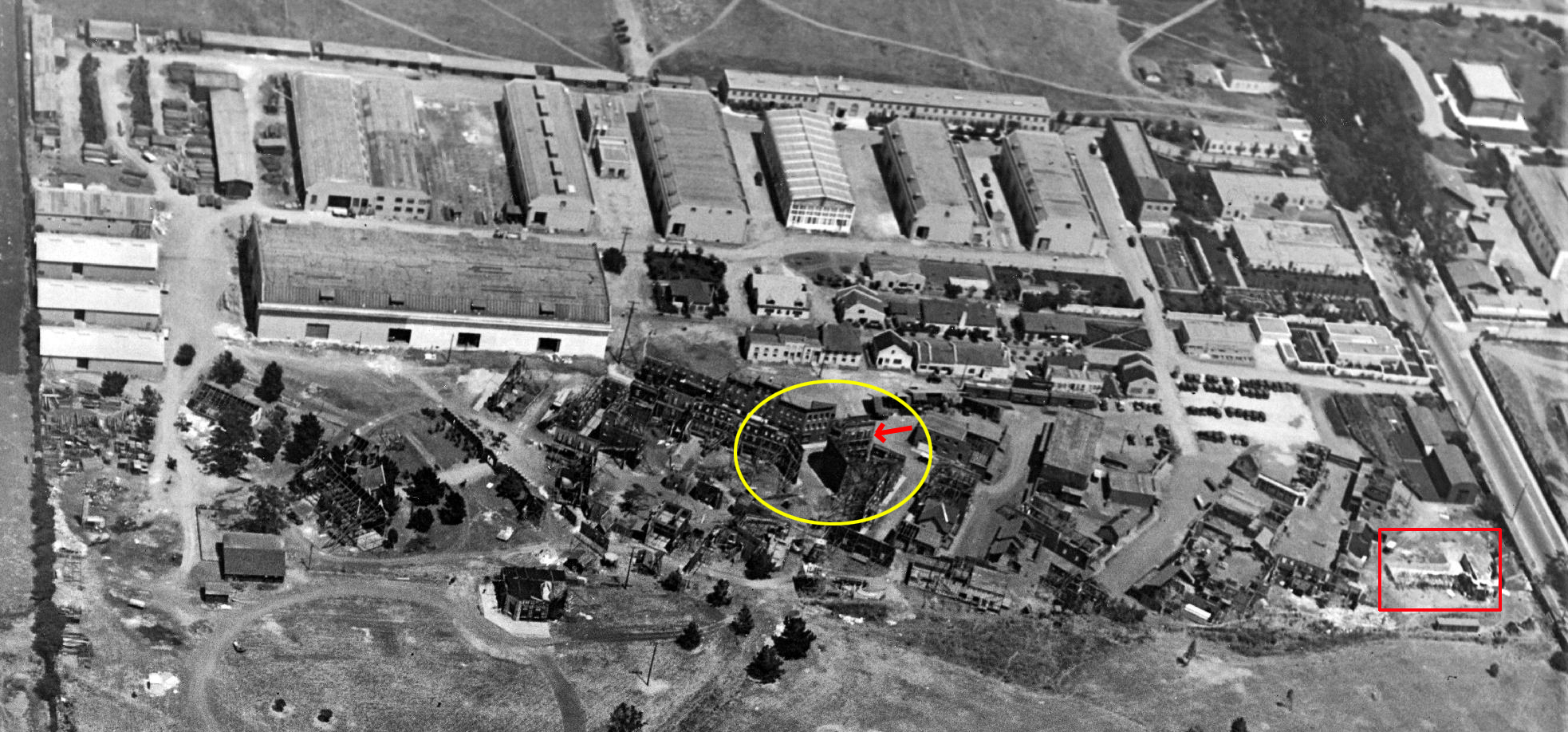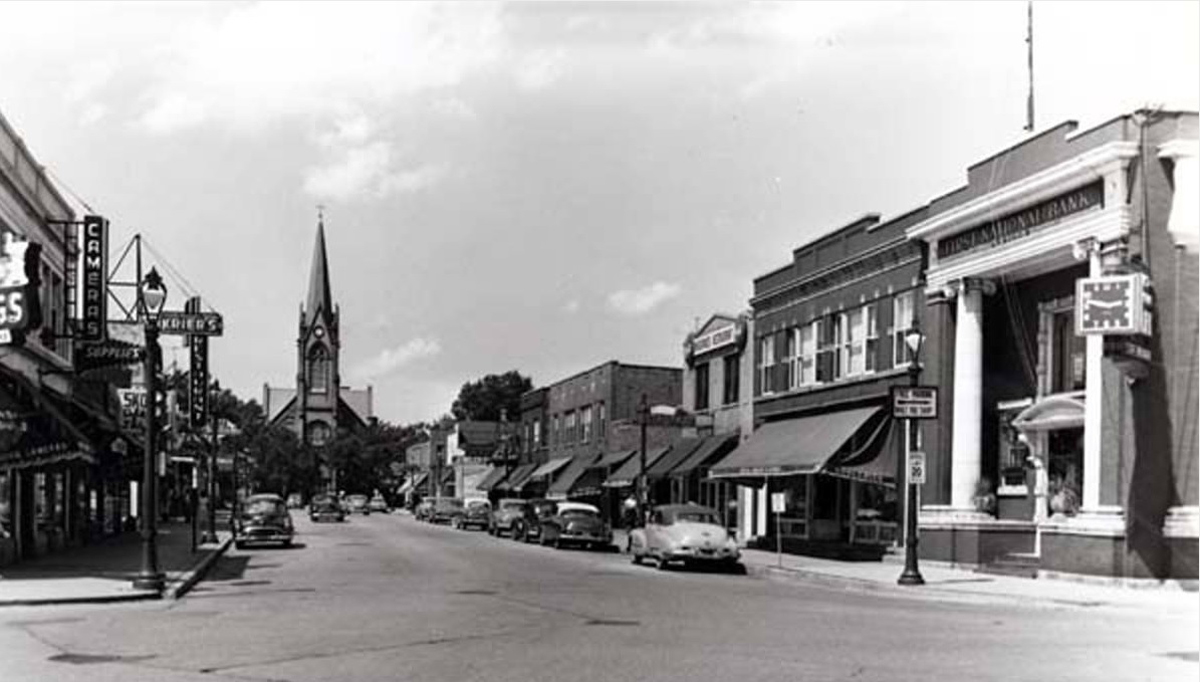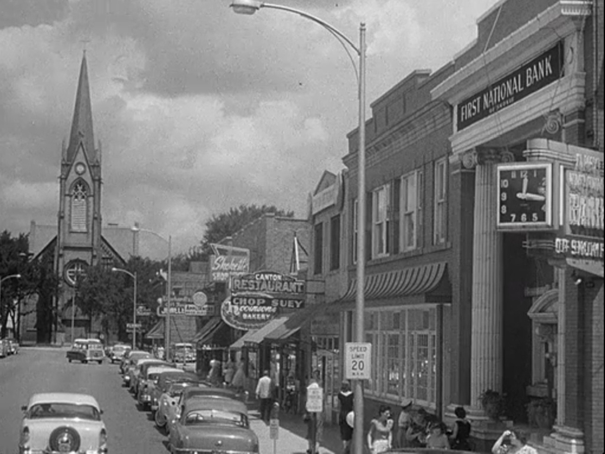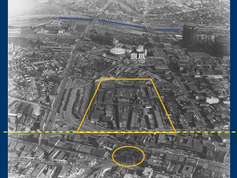 The prominent white house at 215 N. Hill Street portrayed Burt’s family home in Criss Cross. This view below shows that this home (yellow box) and the Majestic Apartments (red box) were two of the last structures standing before Court Hill was excavated.