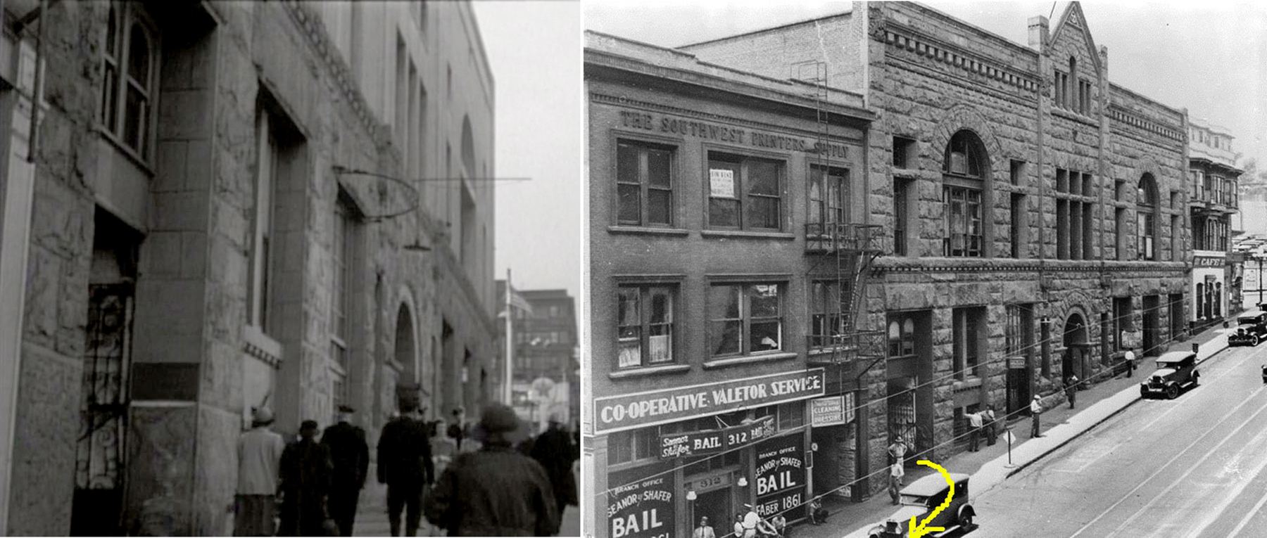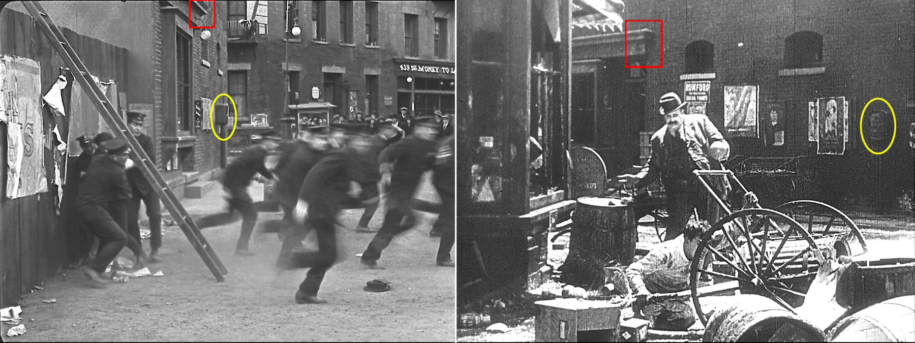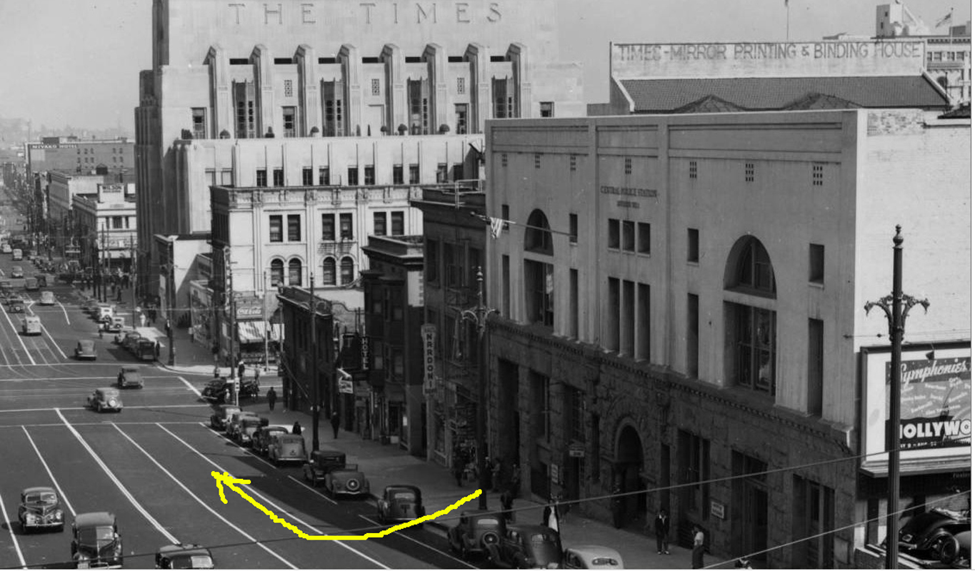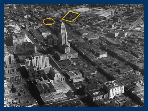 Burt filmed at 215 Hill St (yellow box), Harold at the Majestic on Temple (red box) – Los Angeles Public Library