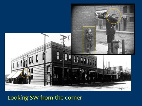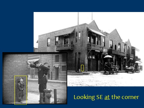 A view from City Hall comparable to the map above – the arrow shows Burt’s path as shown at the top of this post. The box is enlarged below. The oval marks Yvonne’s car, discussed later.