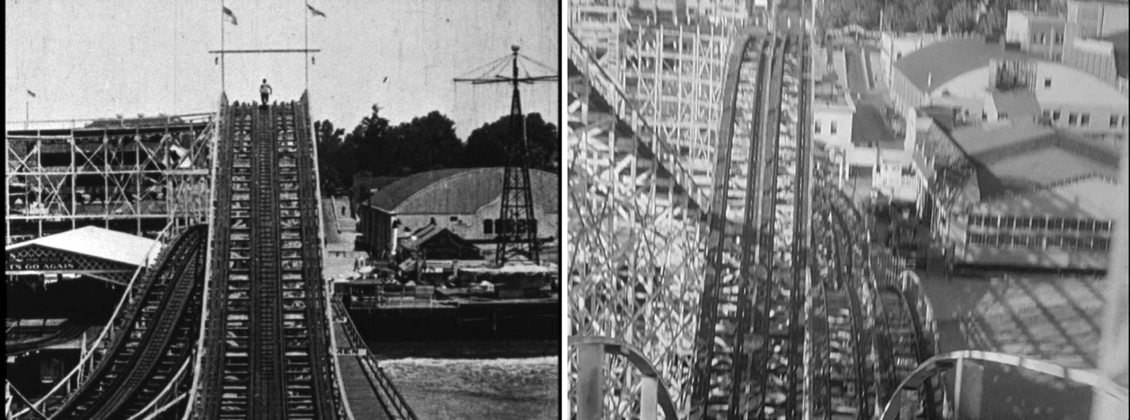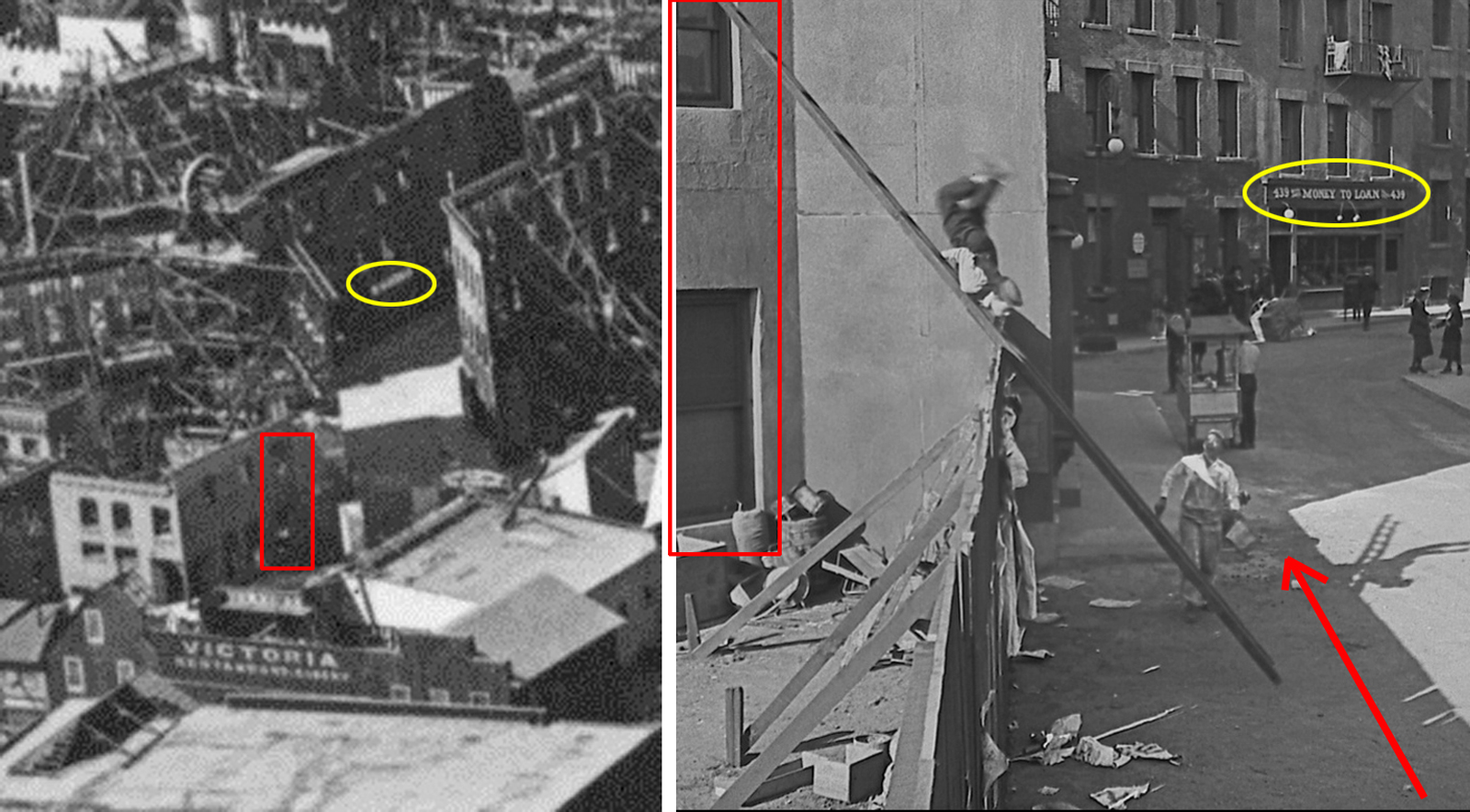 Harold Lloyd, Buster Keaton, and many other silent comedians filmed stunt comedy sequences by building sets on Court Hill overlooking the south end of the former Hill Street Tunnel. As shown at left, filming a set against the street far below, while cropping the tunnel balustrade from view, created the illusion of great height. This remarkable setting was also adjacent to the magnificent Bradbury Mansion, one of the city’s finest original homes, that was later used as an early movie studio by Charlie Chaplin, Harold Lloyd, and Hal Roach, and was close to Court Flight, the city’s second (and now lost) funicular railway. You can see more pictures of the Bradbury Mansion, Court Flight, and the south end of the Hill Street Tunnel, in this earlier post (HERE), and can read all about them in my three books. (Note: this is my sixth post so far connecting silent comedy and film noir – there will be many more, especially regarding Harold Lloyd. You can link to these other noir posts HERE).