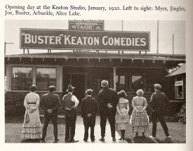 The Bryson portrayed the front of the Mack Sennett Keystone Studios, upper left above, during one of Charlie Chaplin’s earliest movies, A Film Johnnie (completed February 11, 1914, barely his second month on the job). In that film Charlie’s “Little Tramp” pesters Keystone actors as they enter and depart the “studio.” While the true Keystone studio façade actually appears in dozens of other Sennett productions, for some reason the far more impressive Bryson was employed in the Chaplin film. (Upper right –LAPL). The Bryson’s prominent front fire escape appears several times during Soft Shoes, lower left above, along with the distinctive stone lions that still guard the apartment entranceway.