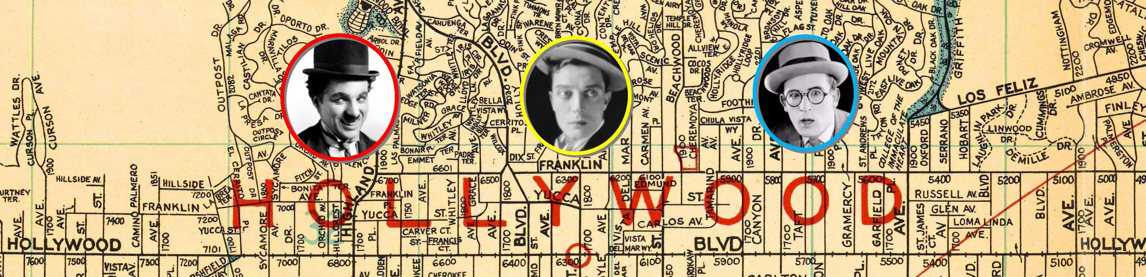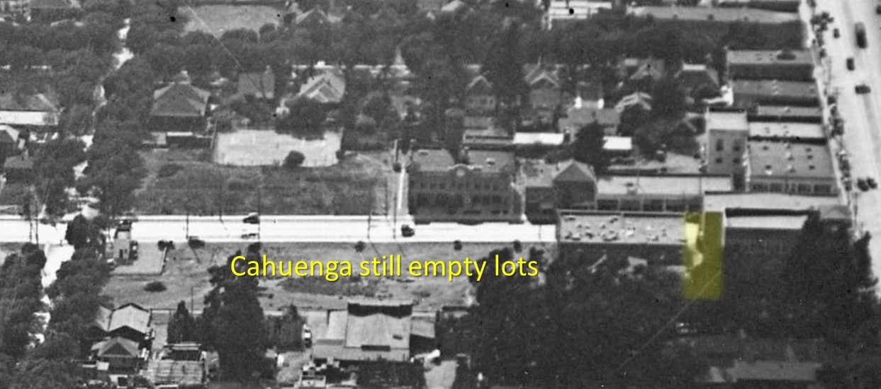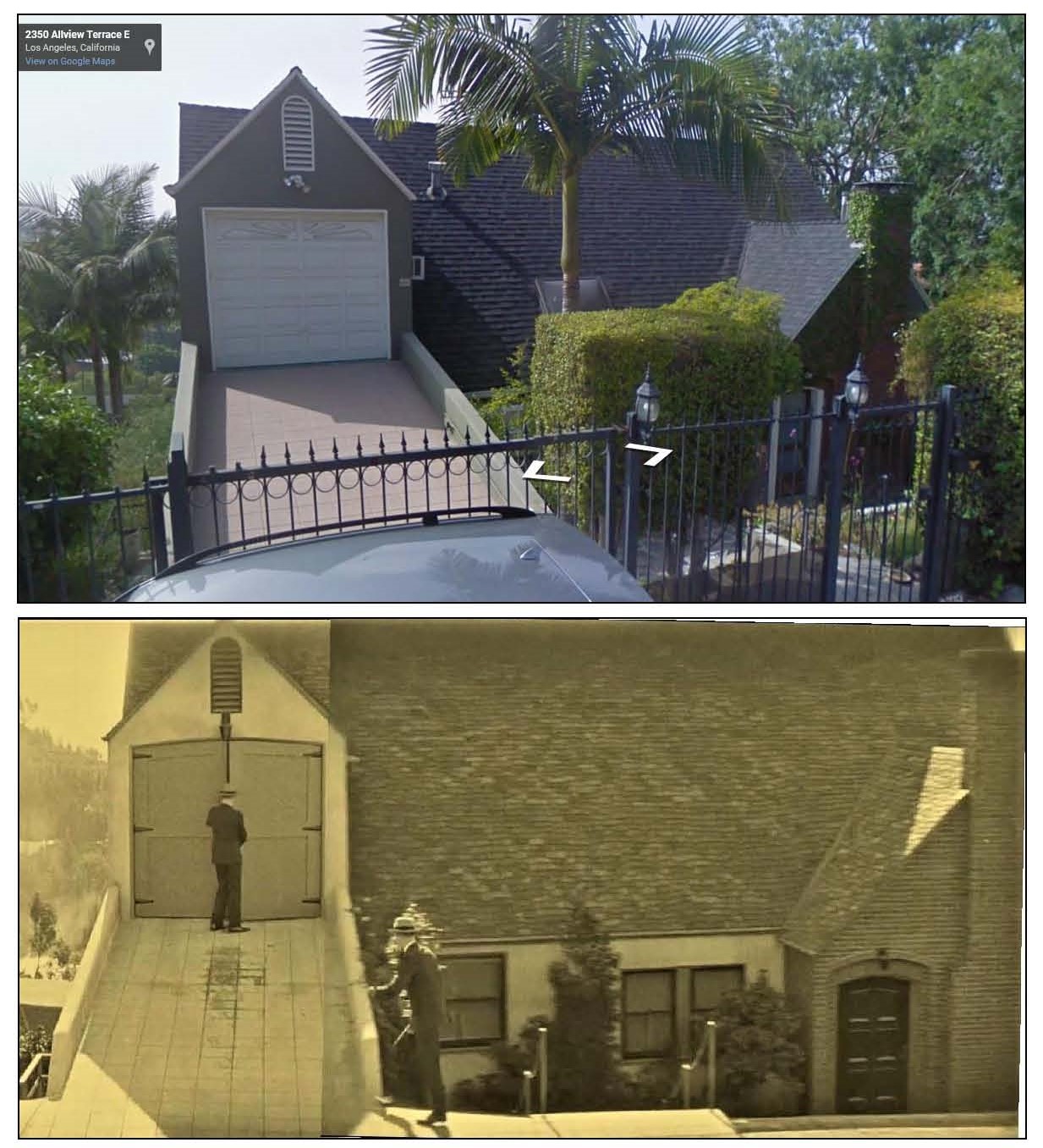 Upper left (yellow), Harry Carey runs south from Apablasa Street towards Marchesault Street, down a narrow connecting alley – this may be the only surviving image taken within this alley. Lower left (red), Chaplin at the corner of Cayetano and Apablasa. The purple arrow points west down Apablasa, matching Stan Laurel’s view, below. UC Santa Barbara c-2744_3.