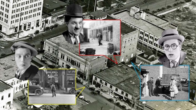A wide view looking west down Apablasa, with The Kid/Soft Shoes alley corner at the left. Stan Laurel appears at right in Mandarin Mixup (1924). Chaplin filmed Caught In A Cabaret (1914) beside the central building at back. You can read more about Chaplin and Laurel filming in Chinatown on Apablasa (below) in this post HERE.
