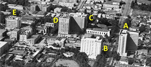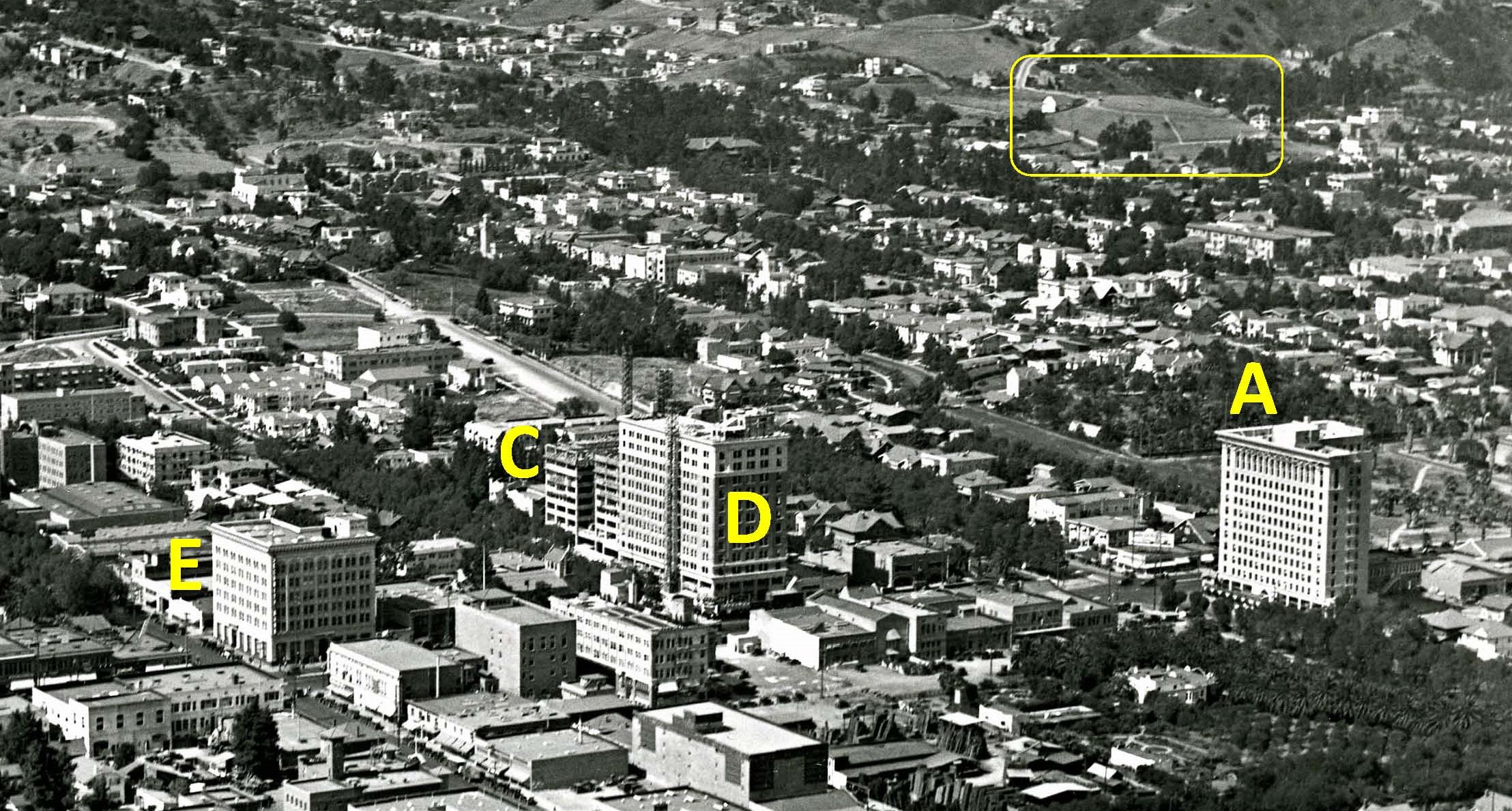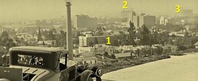 The view above looking NW from the Franconia roof (left) reveals a stretch of Rampart Boulevard, beginning with the Villa d’Este Apartments at 401 Rampart (A), to the corner of Rampart and W. 3rd Street (D), all appearing in Harold Lloyd’s For Heaven’s Sake (1926) (right, Harold with straw hat). As I explain in my Lloyd book Silent Visions, Harold filmed the drunken groomsmen bus scene, shown here, extensively on Rampart between 6th and 3rd, where nearly every building on the street appears onscreen and remains standing today. The Rampart corner (D) also appears in Lloyd’s Girl Shy (1924).