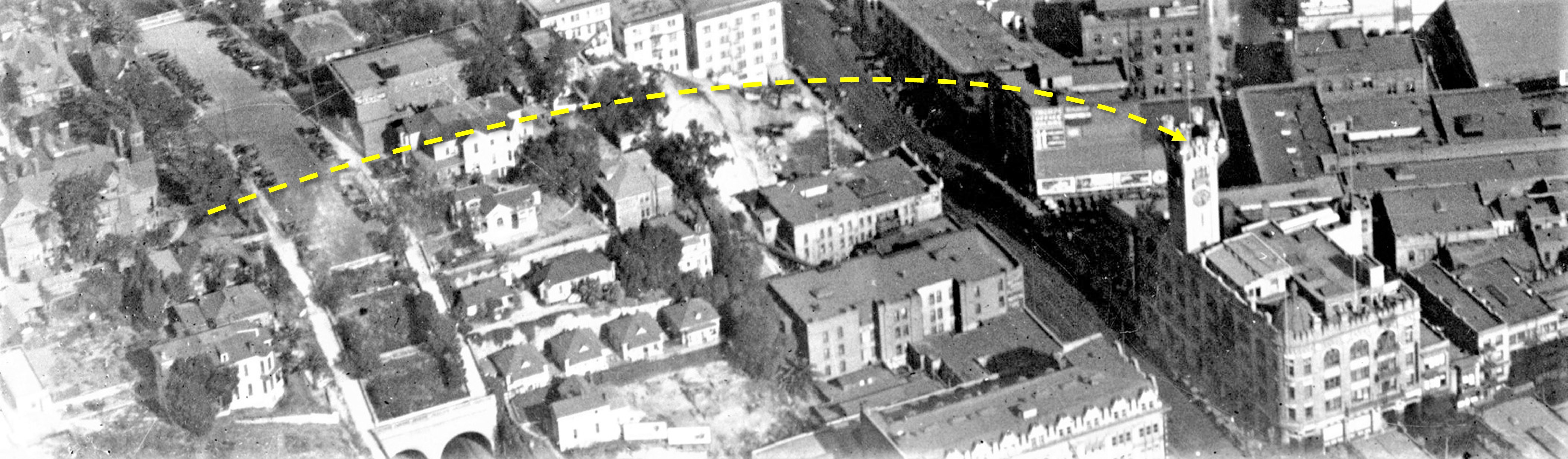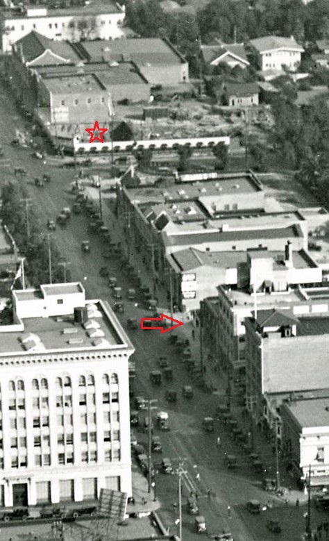 Moments later, Carey switches between cars as they pass on a steep hill, filmed just a block further east along Marine between 3rd and 4th. The retaining walls on the south side of Marine appearing in the film remain in place today. This aerial view clearly shows the Masonic Temple (box), the church (oval), and the hilly street with the retaining walls to the right (line) depicted in the film.