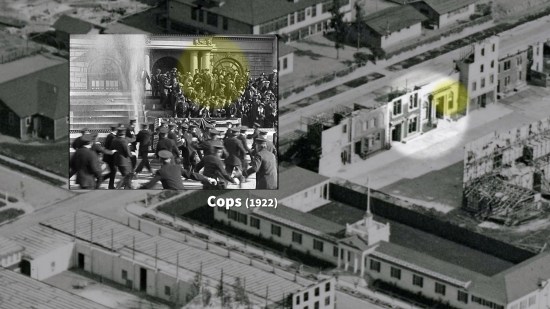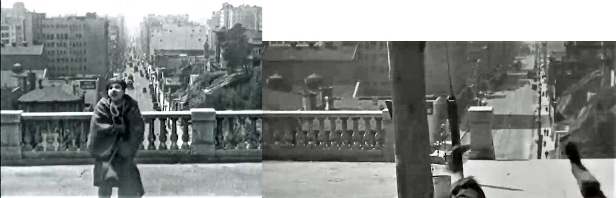 (Above, Huntington Digital Library, left, Soft Shoes upper right, Chaplin’s The Kid, lower right). Once the original leases expired, most of Chinatown was sold in 1914 to make way for the future Union Train Station. After years of litigation, the Chinese were evicted in 1934 for construction of the new terminal that opened to great acclaim in 1937. That same year community leaders formulated a master plan to develop a new Chinatown between Hill and Broadway, a mile northwest from its former site, where it remains today. Three identifiable scenes from Soft Shoes were filmed at the same spot, the corner of a narrow alley running from Marchesault Street to Apablasa Street, across from the corner of Cayetano Alley. Remarkably, one shot matches exactly where Charlie Chaplin filmed a critical scene from The Kid (1921). Here above (upper right Soft Shoes, lower right The Kid) are identical views looking south from Cayetano, across Apablasa, towards the narrow alley corner.
