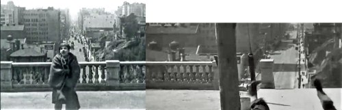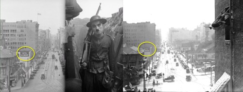 Here Carey peeks north up Coronado, with buildings at back still standing. The Franconia’s decorative rooftop ledges were removed for earthquake safety reasons. Carey crouches on the south ledge of the north wing, while the camera peers across towards him from the south wing.