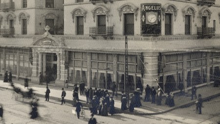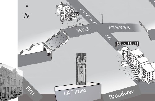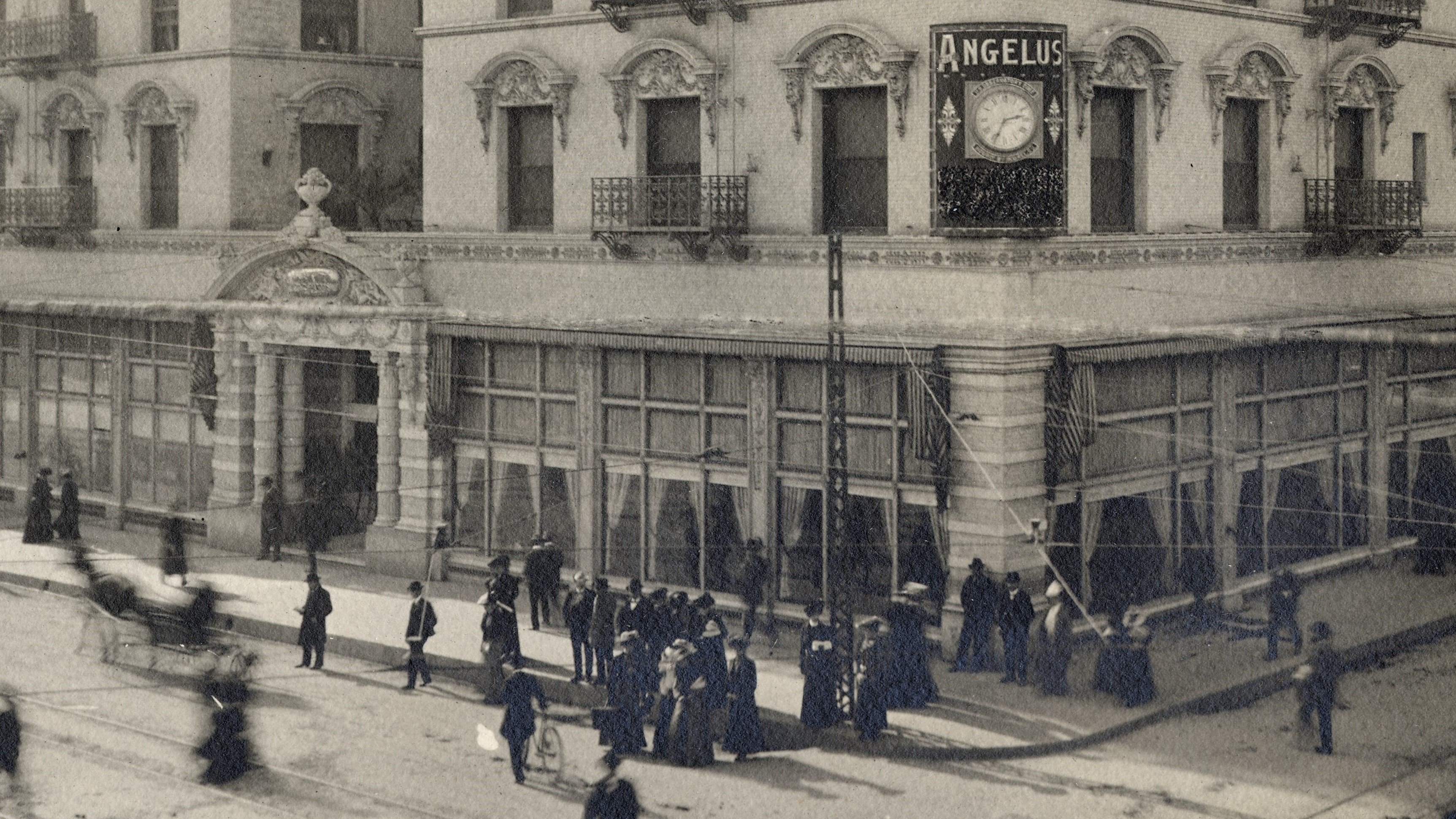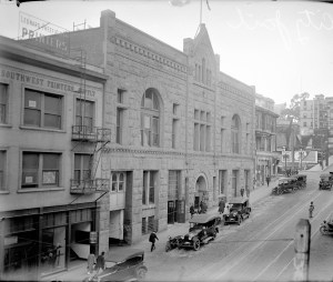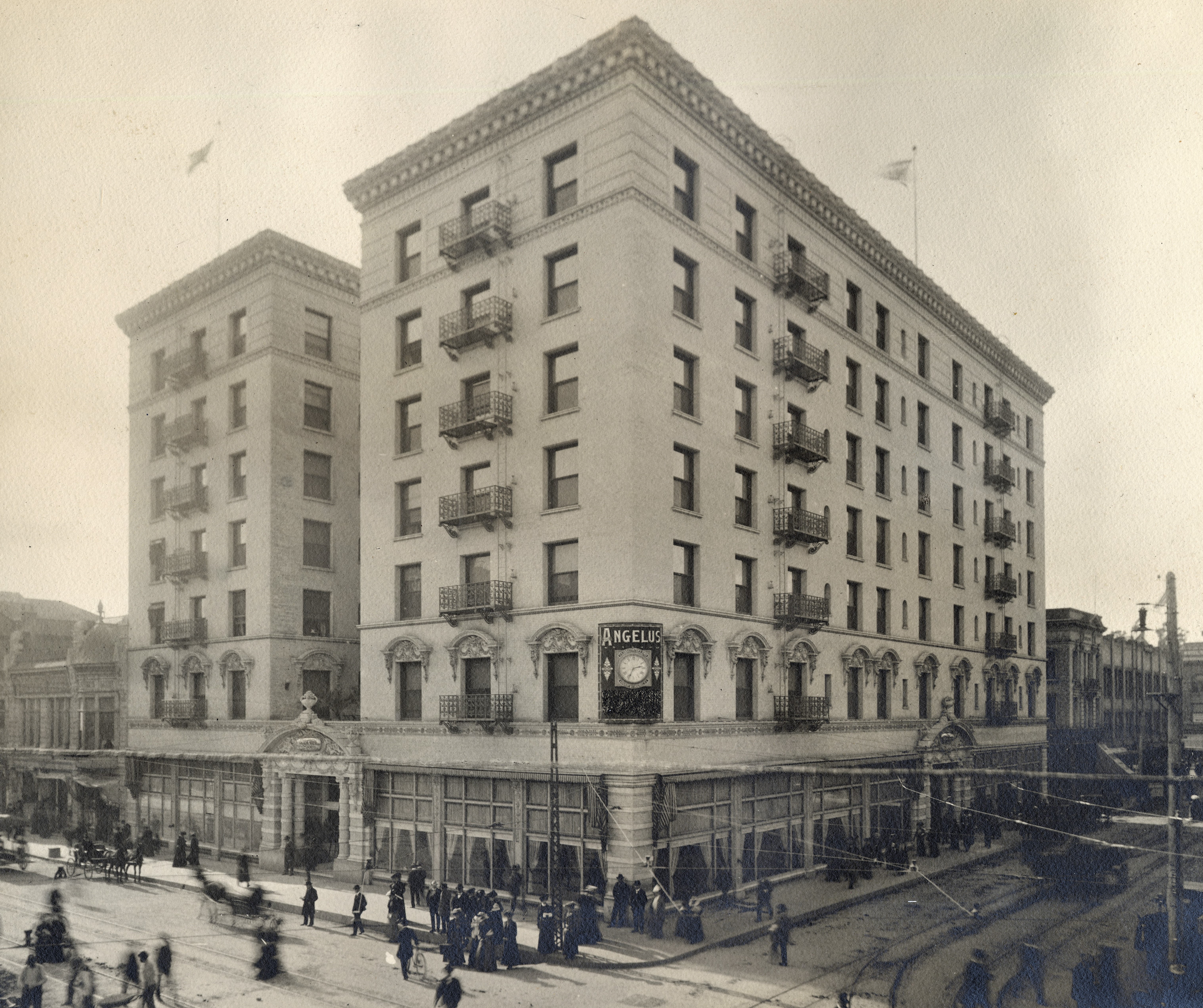 A closer view of the west side of the former Masonic Temple (center), and at back, the former St. Clement’s Church (LAPL), both long demolished.