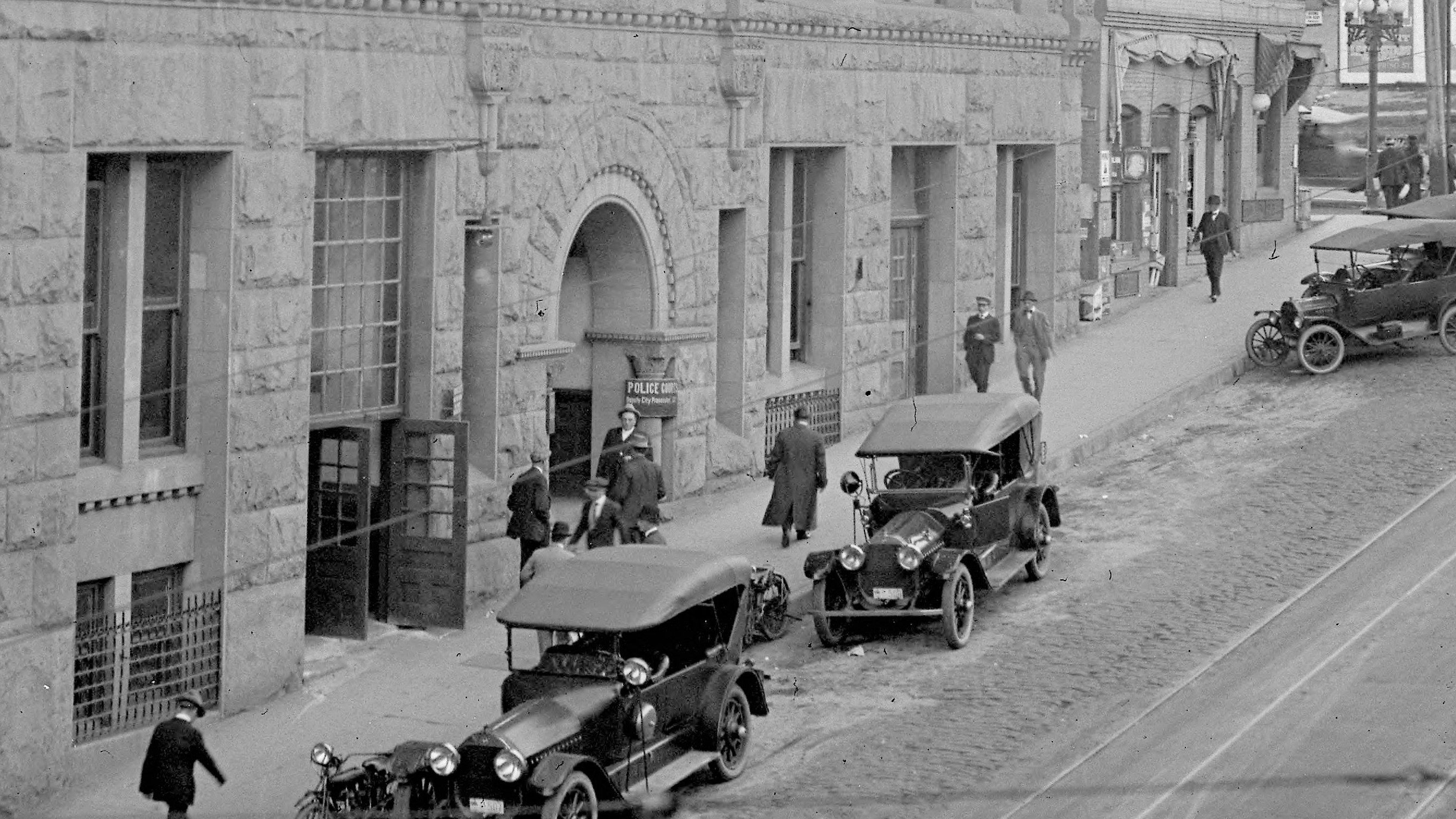 This scene of a cop racing towards what turned out to be the Franconia contains two vital clues. At the time J. W. Calder had two corner drug stores, but only his store at 2549 W 6th Street aligned with a tall building at back. As such, this