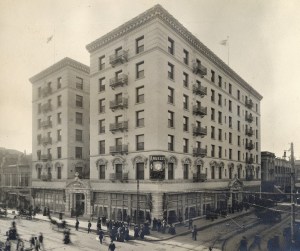 Soft Shoes also features the police chasing Harry around another high rise, including the roof, filmed at the Franconia Apartments still standing at 6th and Coronado north of MacArthur Park, pictured above facing 6th Street. The Asbury Apartments mentioned below appears to the far right. USC Digital Library.