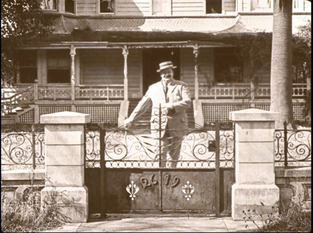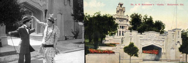 The Bryson portrayed the front of the Mack Sennett Keystone Studios, upper left above, during one of Charlie Chaplin’s earliest movies, A Film Johnnie (completed February 11, 1914, barely his second month on the job). In that film Charlie’s “Little Tramp” pesters Keystone actors as they enter and depart the “studio.” While the true Keystone studio façade actually appears in dozens of other Sennett productions, for some reason the far more impressive Bryson was employed in the Chaplin film. (Upper right –LAPL). The Bryson’s prominent front fire escape appears several times during Soft Shoes, lower left above, along with the distinctive stone lions that still guard the apartment entranceway.