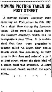 Click to enlarge. The “Billiards” building far right in the movie frame is newer, built after the photo was taken. The far right photo building says “BRADLEY” at the roof ledge, matching the Hotel Bradley in the movie frame. The J.N. Mooser Dry Goods building appears as Ocean Park Dry Goods in the movie frame. Note the matching sidewalk clock in both images.