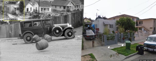 This scene above (cropped) of Carey fleeing by automobile was filmed looking east on Pier Avenue towards Main from what was once called Ocean Front (now Neilson Way), the grand promenade that originally fronted the beach. The “FARROW’S RESTAURANT” appearing at back once stood at 130 Pier Avenue, on the ground floor of the Hotel Bradley at 130 1/2 Pier Avenue. Further back stands the Olga Hotel at 142 1/2 Pier Avenue. None of the buildings captured in this scene remain in the modern view (left).