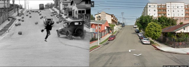 the film’s many exteriors were all filmed, unsurprisingly, in Los Angeles instead. But as shown below, the movie intersects remarkably with classic films made by Charlie Chaplin, Harold Lloyd, and Stan Laurel, while documenting historic LA settings, including its long lost Chinatown. This brief shot at left, looking west towards the Ferry Building, is the lone scene filmed in San Francisco.