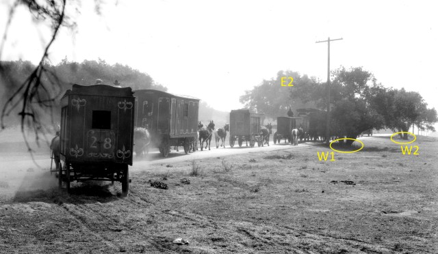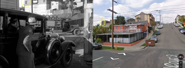 Upper left (yellow), Harry Carey runs south from Apablasa Street towards Marchesault Street, down a narrow connecting alley – this may be the only surviving image taken within this alley. Lower left (red), Chaplin at the corner of Cayetano and Apablasa. The purple arrow points west down Apablasa, matching Stan Laurel’s view, below. UC Santa Barbara c-2744_3.