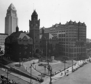 A closer view of the west side of the former Masonic Temple (center), and at back, the former St. Clement’s Church (LAPL), both long demolished.