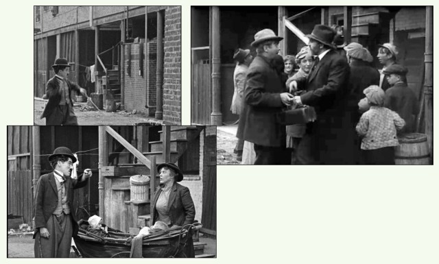 Above, Soft Shoes left, looking SW, a composite image from Chaplin’s The Kid, right, looking south. Both views show the same drainspout and corner alley bulletin board.