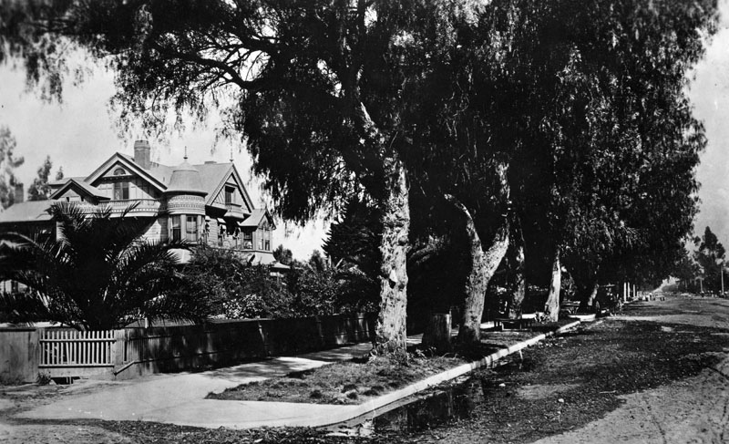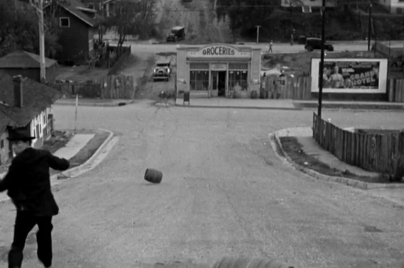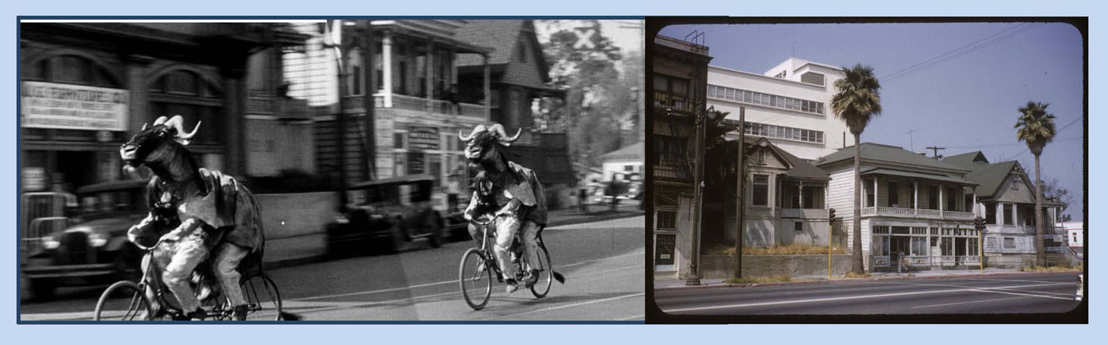 Late in the film, Carey and others run along dingy Chinatown alleys and street corners. Built in the 1880s, the original Chinatown grew east of the Plaza de Los Angeles on former grazing land owned by Mexican land baron Juan Apablasa and his son Cayetano. Denied property ownership, and restricted from living elsewhere, the Chinese suffered the neglect of their landlords, who left the privately owned streets of Chinatown unpaved. Crammed among noisy railroad tracks, towering gaswork plants, and the frequently overflowing Los Angeles River, Chinatown was the city’s least desirable address.