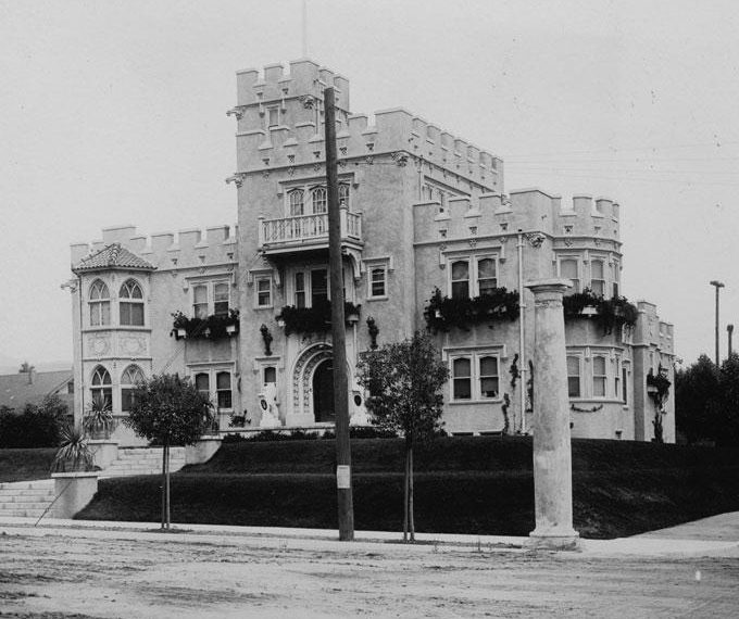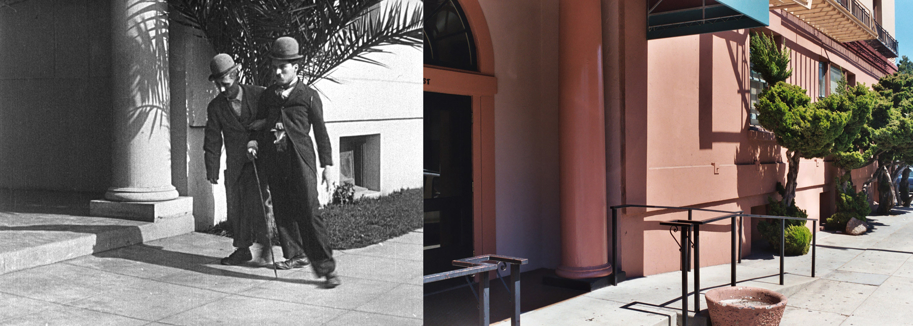 Built in 1913, the Bryson also appears prominently above Chaplin’s head during a scene from his Mutual comedy The Rink (1916), where Charlie meets Edna Purviance on the street at the SE corner of Wilshire Place and Ingraham (now Sunset Place). The Bryson may be best known as a setting described in Raymond Chandler’s 1943 Philip Marlowe detective classic The Lady in the Lake. Color photo Jeffrey Castel De Oro.