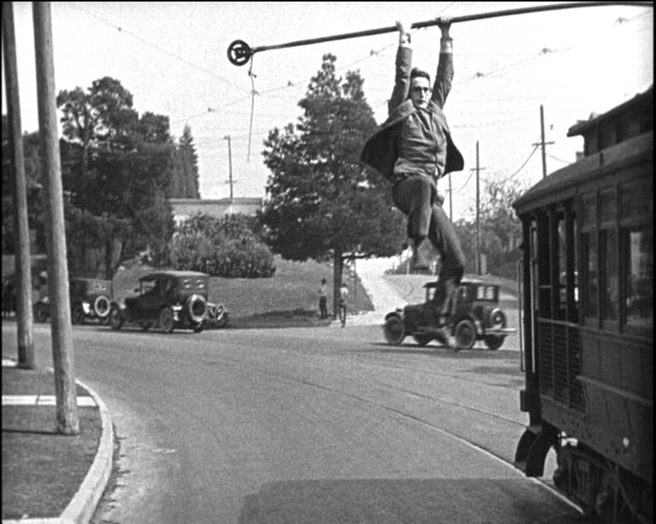 The view above looking NW from the Franconia roof (left) reveals a stretch of Rampart Boulevard, beginning with the Villa d’Este Apartments at 401 Rampart (A), to the corner of Rampart and W. 3rd Street (D), all appearing in Harold Lloyd’s For Heaven’s Sake (1926) (right, Harold with straw hat). As I explain in my Lloyd book Silent Visions, Harold filmed the drunken groomsmen bus scene, shown here, extensively on Rampart between 6th and 3rd, where nearly every building on the street appears onscreen and remains standing today. The Rampart corner (D) also appears in Lloyd’s Girl Shy (1924).