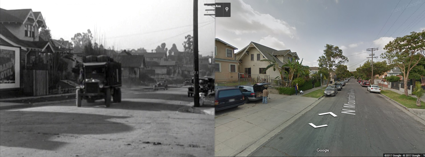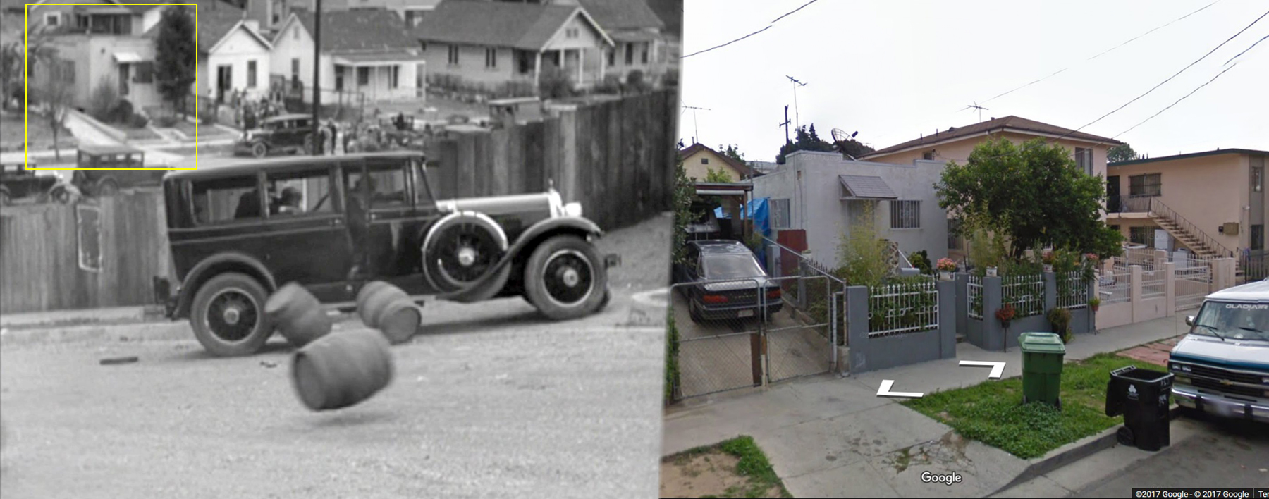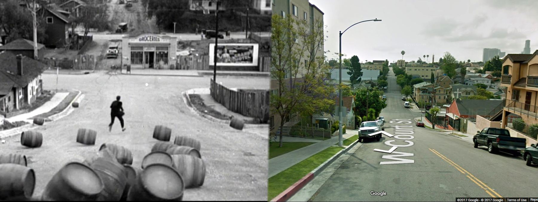 Upper left (yellow), Harry Carey runs south from Apablasa Street towards Marchesault Street, down a narrow connecting alley – this may be the only surviving image taken within this alley. Lower left (red), Chaplin at the corner of Cayetano and Apablasa. The purple arrow points west down Apablasa, matching Stan Laurel’s view, below. UC Santa Barbara c-2744_3.