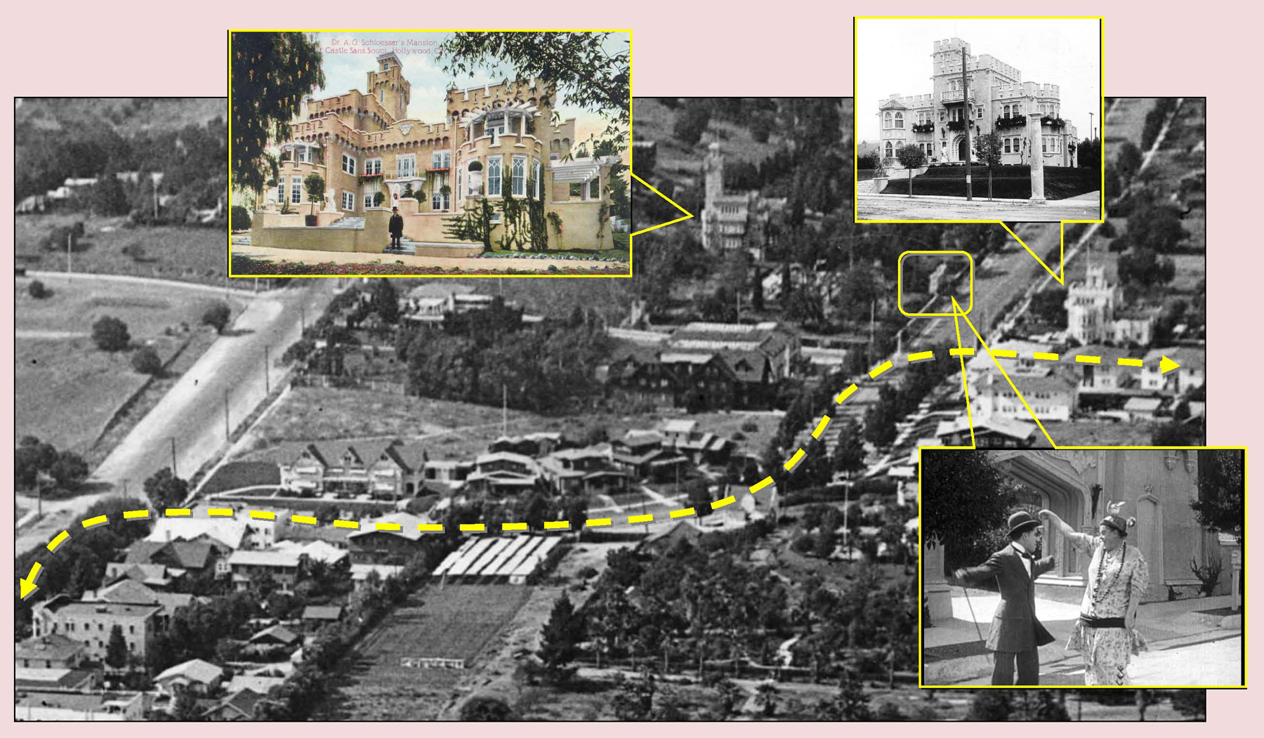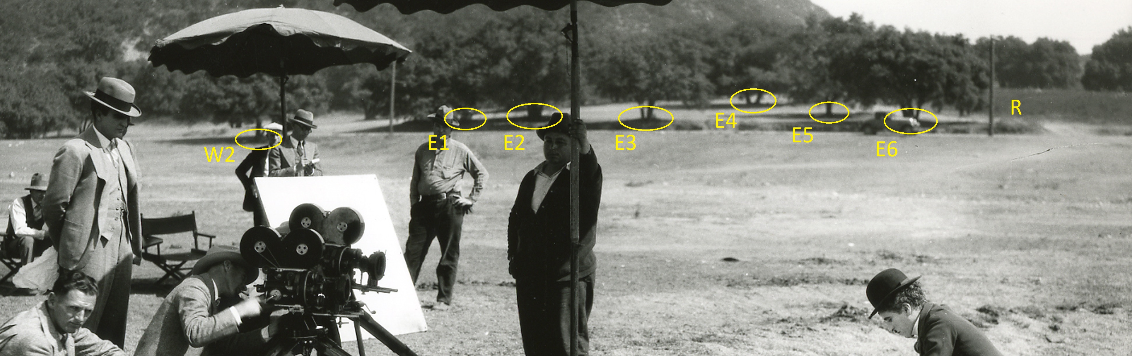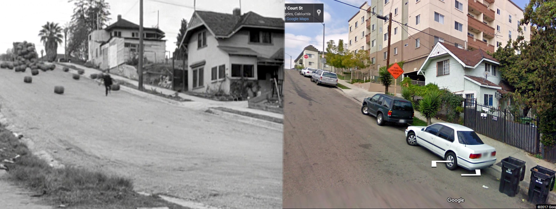 Upper left (yellow), Harry Carey runs south from Apablasa Street towards Marchesault Street, down a narrow connecting alley – this may be the only surviving image taken within this alley. Lower left (red), Chaplin at the corner of Cayetano and Apablasa. The purple arrow points west down Apablasa, matching Stan Laurel’s view, below. UC Santa Barbara c-2744_3.