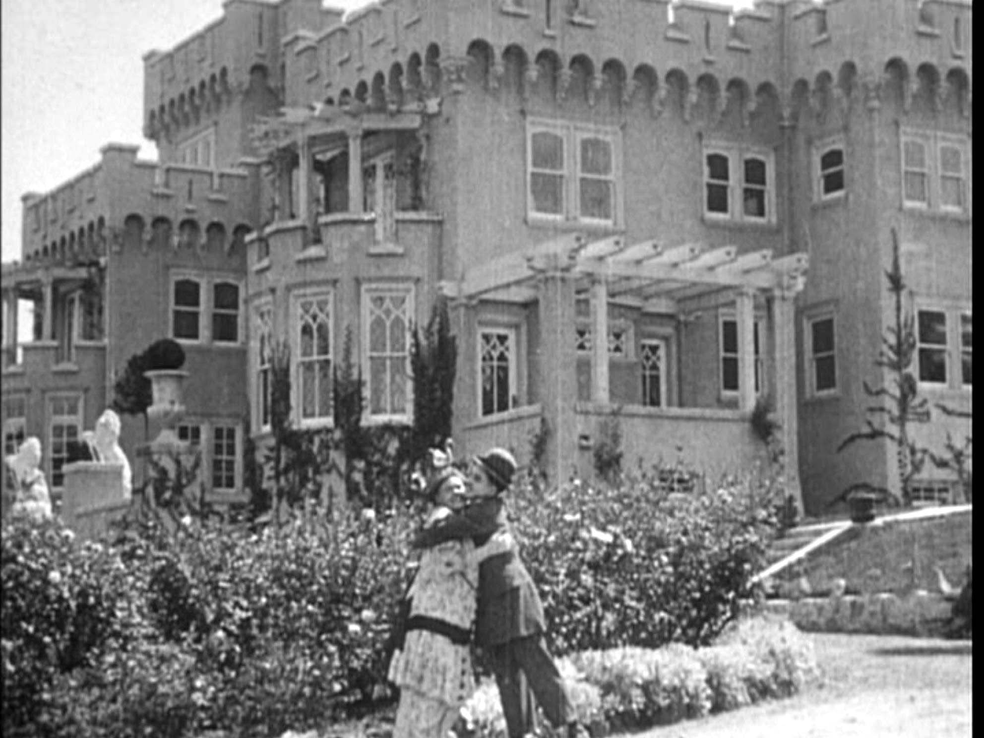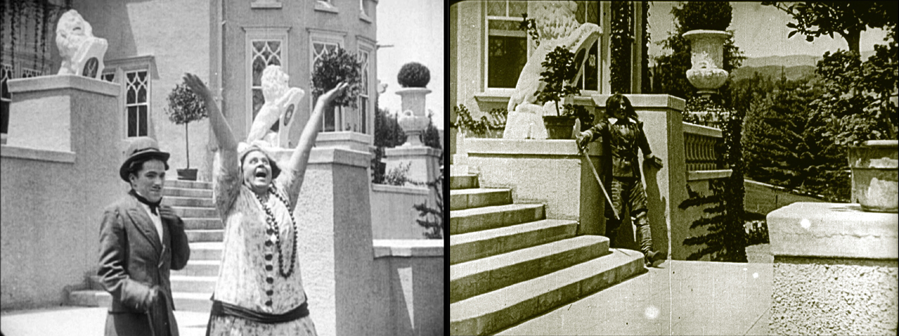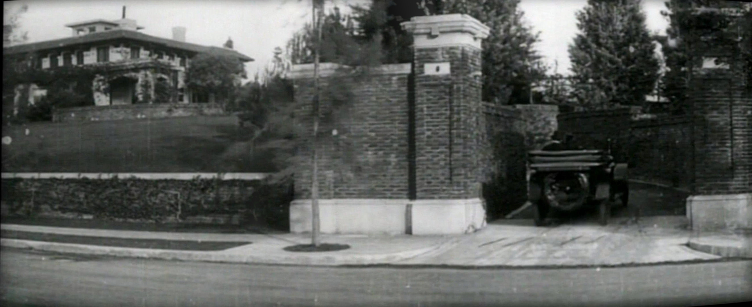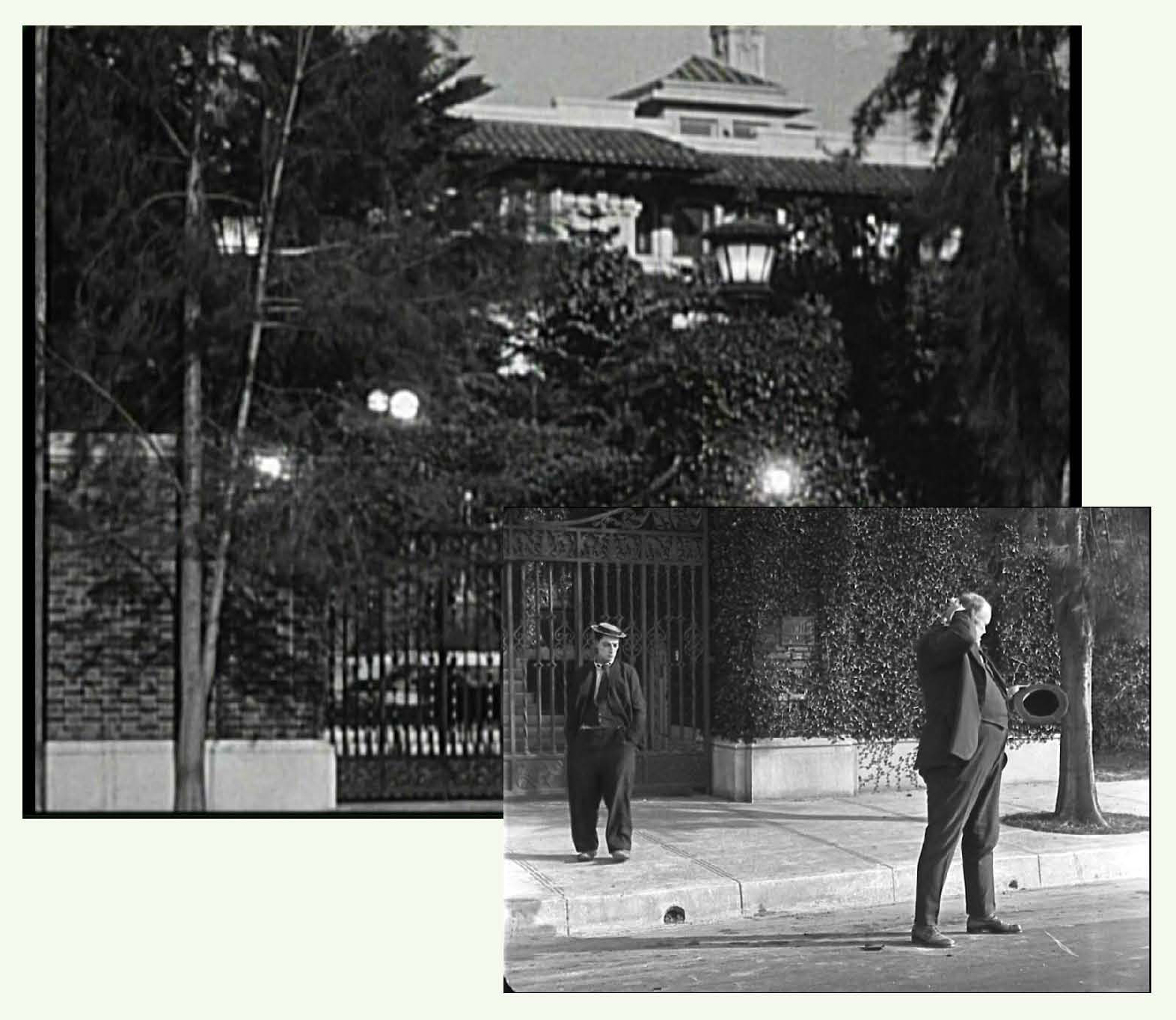 The Bryson portrayed the front of the Mack Sennett Keystone Studios, upper left above, during one of Charlie Chaplin’s earliest movies, A Film Johnnie (completed February 11, 1914, barely his second month on the job). In that film Charlie’s “Little Tramp” pesters Keystone actors as they enter and depart the “studio.” While the true Keystone studio façade actually appears in dozens of other Sennett productions, for some reason the far more impressive Bryson was employed in the Chaplin film. (Upper right –LAPL). The Bryson’s prominent front fire escape appears several times during Soft Shoes, lower left above, along with the distinctive stone lions that still guard the apartment entranceway.