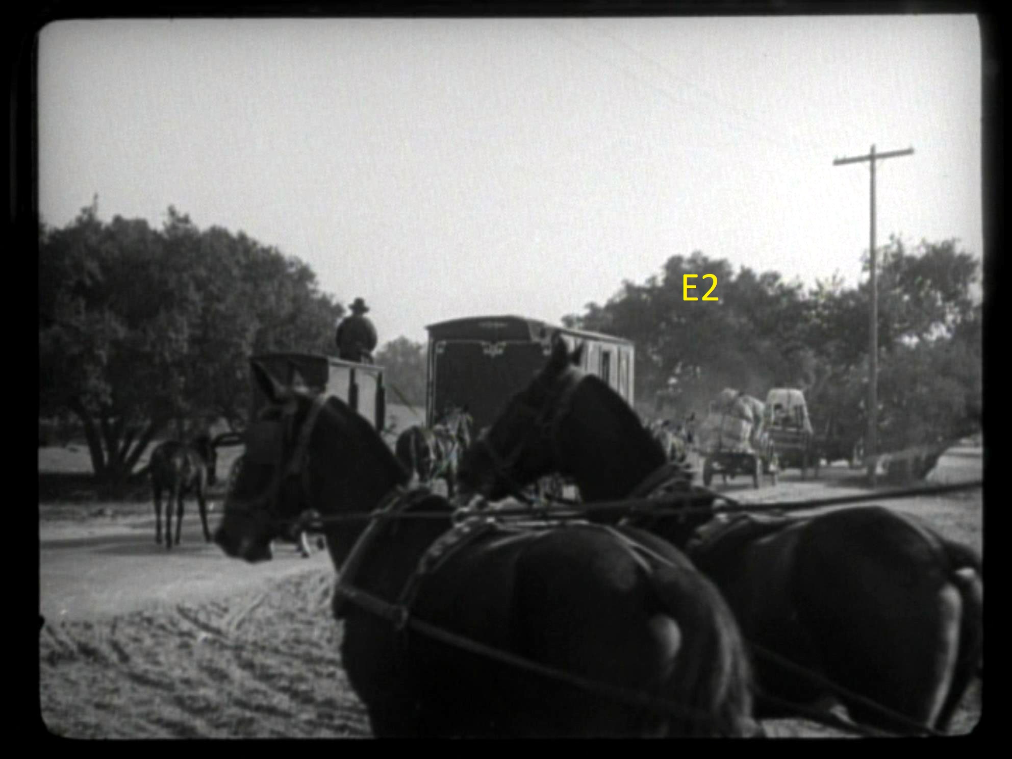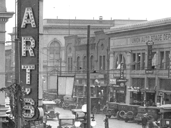 Click to enlarge. The “Billiards” building far right in the movie frame is newer, built after the photo was taken. The far right photo building says “BRADLEY” at the roof ledge, matching the Hotel Bradley in the movie frame. The J.N. Mooser Dry Goods building appears as Ocean Park Dry Goods in the movie frame. Note the matching sidewalk clock in both images.
