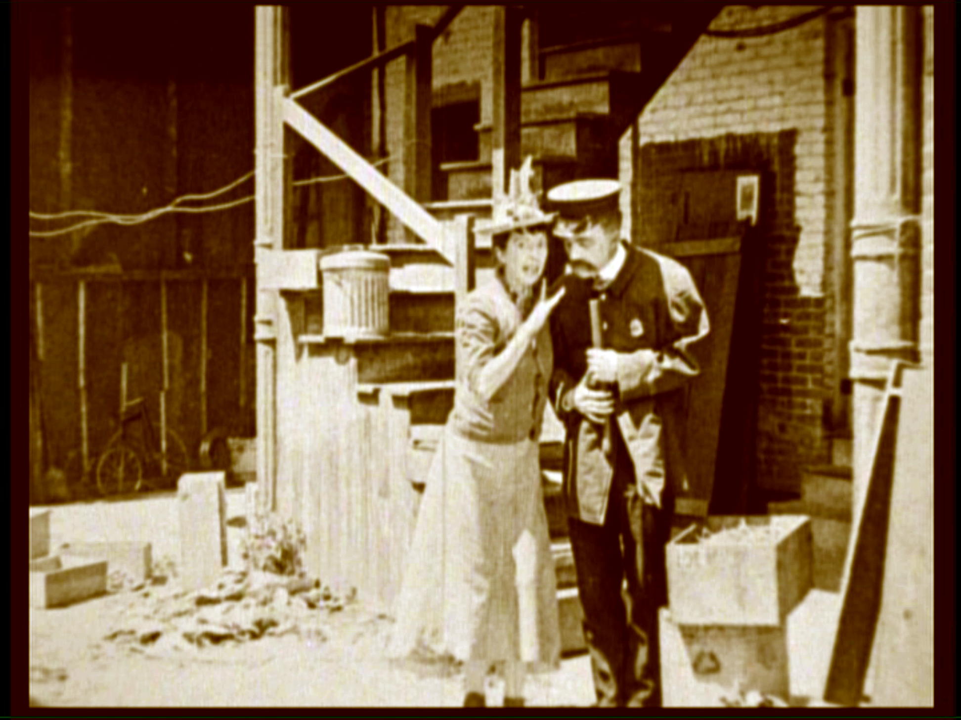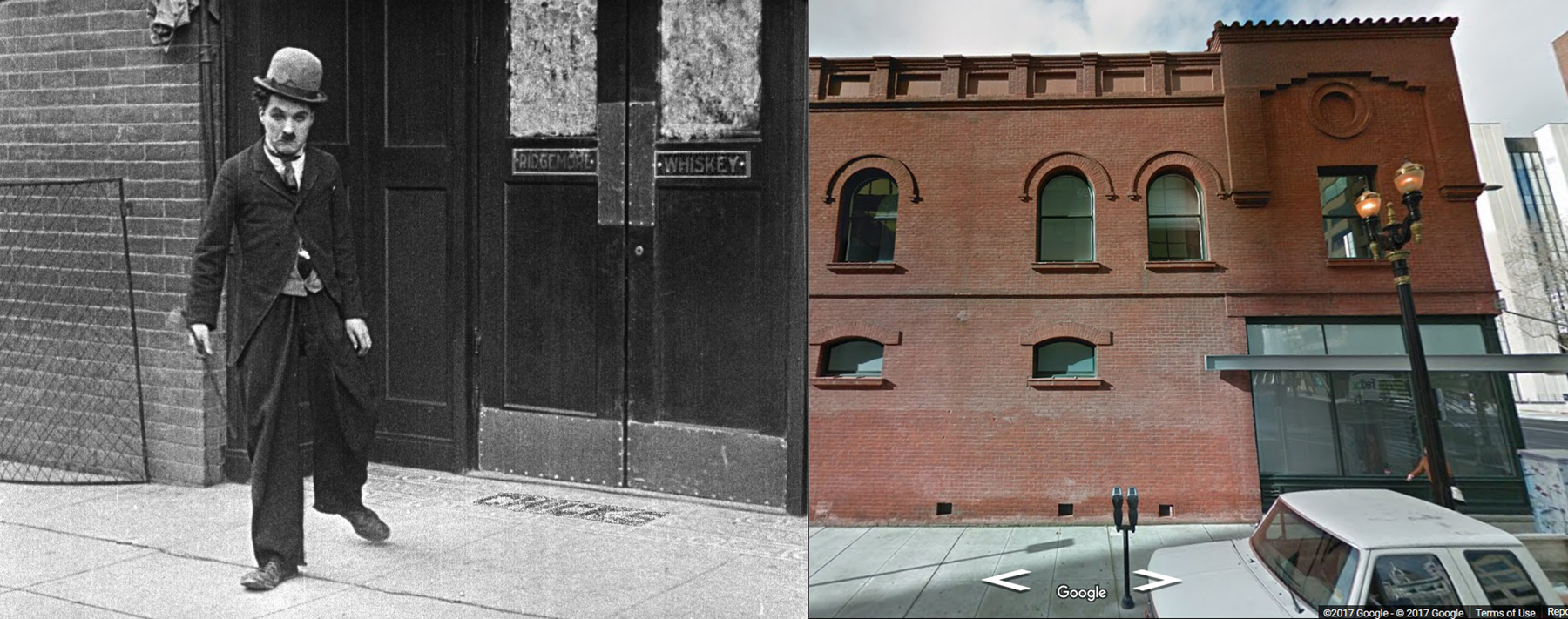 Above, Soft Shoes left, looking SW, a composite image from Chaplin’s The Kid, right, looking south. Both views show the same drainspout and corner alley bulletin board.